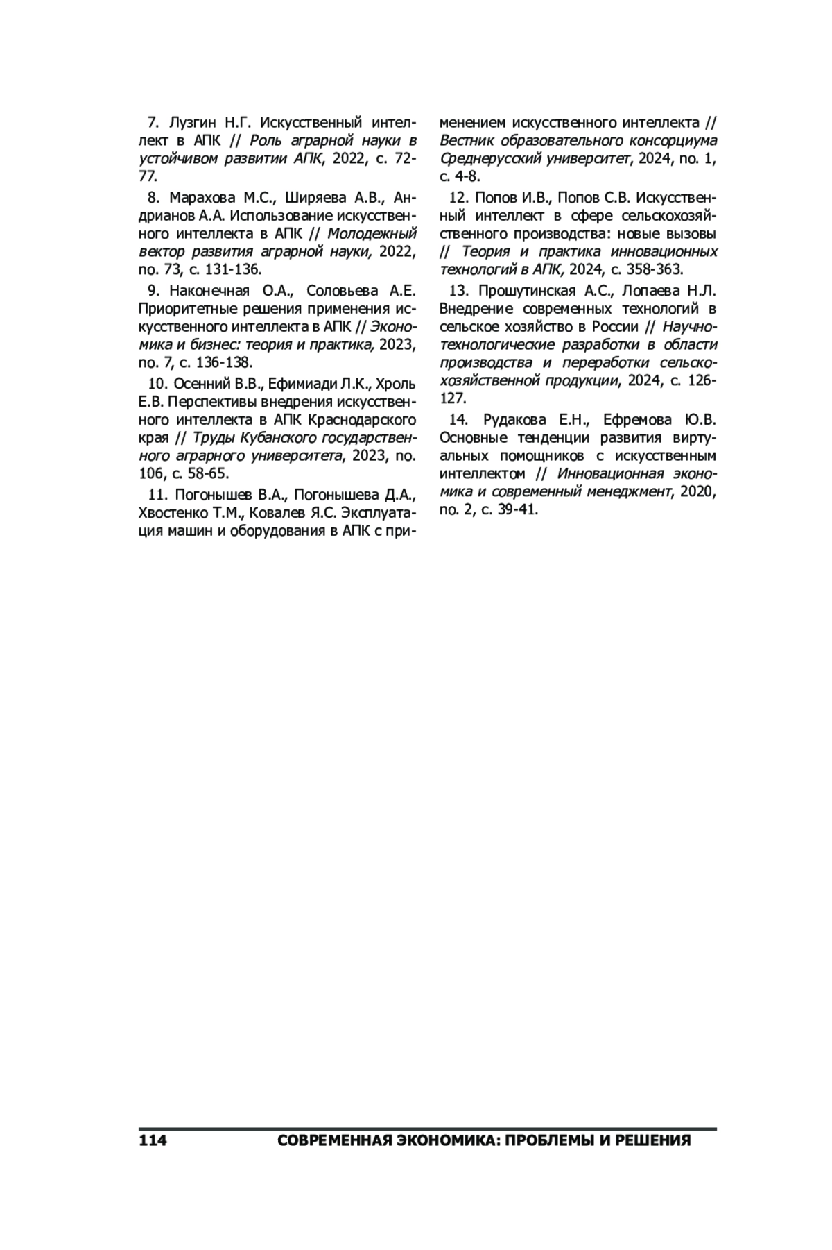 7. Лузгин Н.Г. Искусственный интеллект в АПК // Роль аграрной науки в устойчивом развитии АПК, 2022, с. 7277. EDN: DFLAMJ