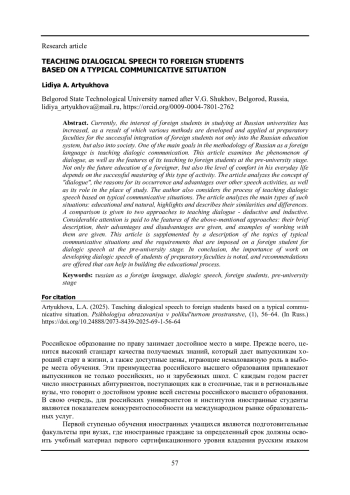 В настоящее время возрос интерес иностранных студентов к обучению в российских вузах, вследствие этого на подготовительных факультетах разрабатываются и применяются различные методики для успешной интеграции зарубежных слушателей не только в российскую систему образования, но и в общество. Одной из главных целей в методике русского языка как иностранного является обучение диалогическому общению. В данной статье рассматривается феномен диалога, а также особенности его преподавания иностранным учащимся на довузовском этапе. От успешного освоения данного вида деятельности зависит не только будущее обучение иностранца, но и уровень комфортности его повседневной жизни. В статье анализируется понятие «диалог», причины его возникновения и преимущества перед другими речевыми видами деятельности, а также его роль в месте занятия. Также автором рассматривается процесс обучения диалогической речи на основе типично-коммуникативных ситуаций. В статье анализируются основные виды таких ситуаций: учебная и естественная, выделяются и описываются их сходства и различия. Дается сравнение двум подходам в обучении диалога - дедуктивному и индуктивному. Значительное внимание уделяется особенностям вышеупомянутых подходов: дается их краткое описание, отмечаются достоинства и недостатки, а также предлагаются образцы работы с ними. Данная статья дополняется описанием тем типично-коммуникативных ситуаций и требований, которые предъявляются к иностранному учащемуся по владению диалогической речью на довузовском этапе. В заключении отмечается важность работы по развитию диалогической речи студентов подготовительных факультетов, а также предложены рекомендации, которые могут помочь в построении учебного процесса.