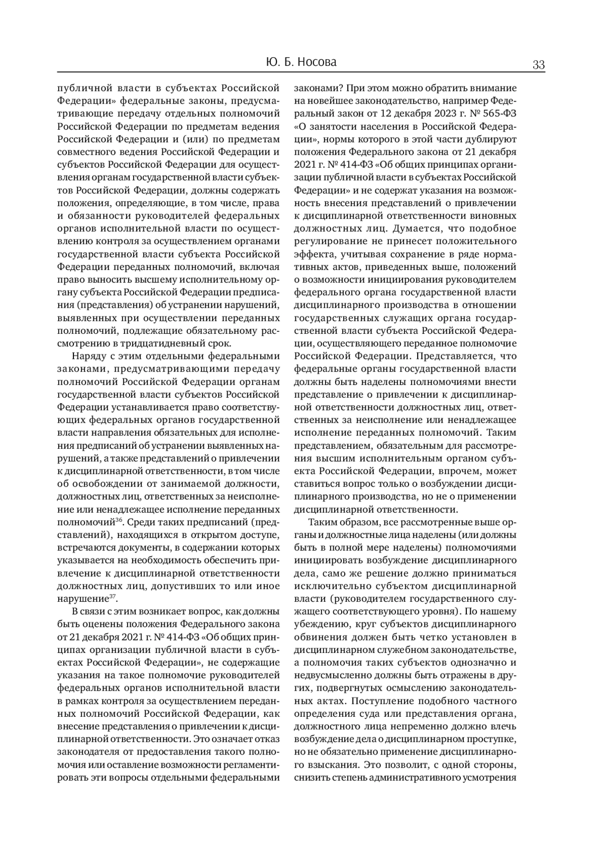 Наряду с этим отдельными федеральными законами, предусматривающими передачу полномочий Российской Федерации органам государственной власти субъектов Российской Федерации устанавливается право соответствующих федеральных органов государственной власти направления обязательных для исполнения предписаний об устранении выявленных нарушений, а также представлений о привлечении к дисциплинарной ответственности, в том числе об освобождении от занимаемой должности, должностных лиц, ответственных за неисполнение или ненадлежащее исполнение переданных полномочий36. Среди таких предписаний (представлений), находящихся в открытом доступе, встречаются документы, в содержании которых указывается на необходимость обеспечить привлечение к дисциплинарной ответственности должностных лиц, допустивших то или иное нарушение.