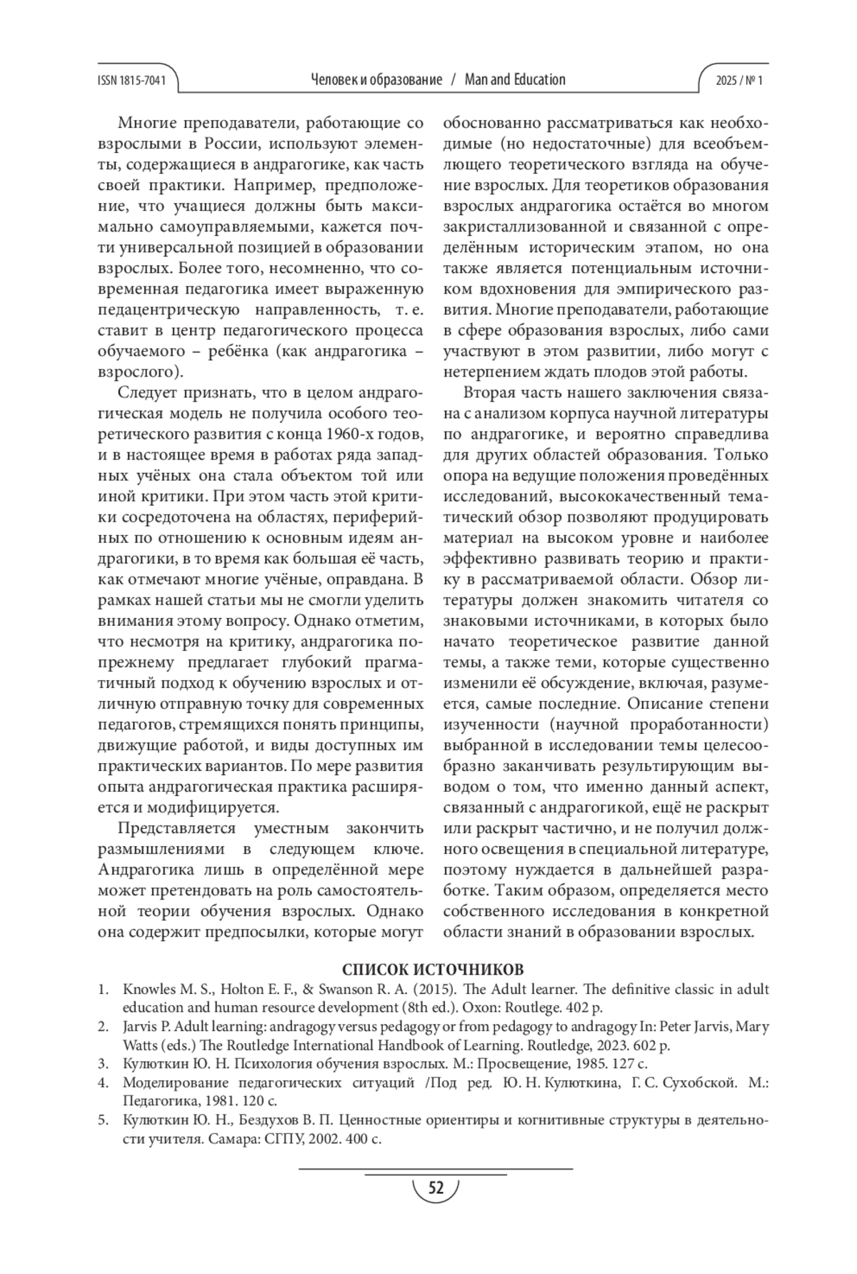 13. Витольник Г. А., Витольник В. Н. Современная андрагогика в обеспечении качественного процесса непрерывного образования взрослых обучающихся // Современное педагогическое образование. 2022. № 5. С. 119-123. EDN: VKHMIX.