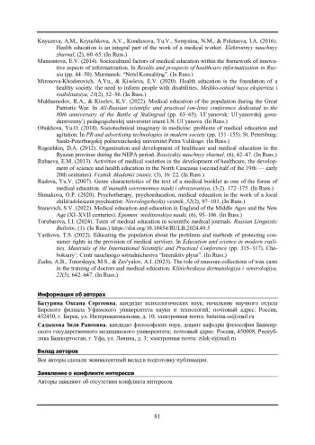 2. Балабанов В.А., Коннова Л.А. Медицинское просвещение как один из путей разрешения проблемы диссимметрии знаний // Психолого-педагогические проблемы безопасности человека и общества. 2010. № 3 (8). С. 74-77.