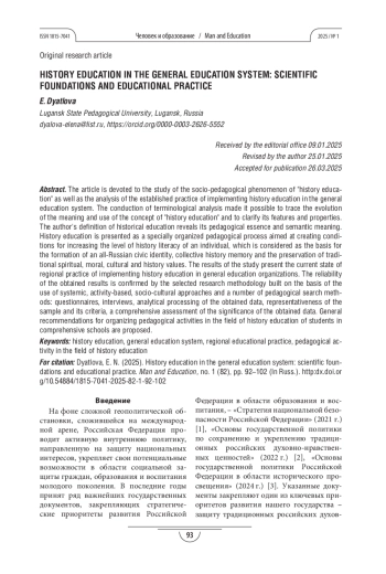 Статья посвящена изучению социально-педагогического феномена «историческое просвещение», анализу сложившейся практики реализации исторического просвещения в системе общего образования. Проведён терминологический анализ, позволивший проследить эволюцию значения и употребления понятия «историческое просвещение», уточнить его признаки и свойства. Предложено авторское определение исторического просвещения, раскрывающее его педагогическую сущность и смысловое значение. Историческое просвещение в России представлено как специально организованный педагогический процесс, направленный на создание условий для повышения уровня исторической памяти и сохранения традиционных духовно-нравственных и культурно-исторических ценностей. Представлены результаты предпринятого исследования с целью изучения актуального состояния региональной практики реализации исторического просвещения исторической грамотности личности, которая рассматривается как основа для формирования общероссийской гражданской идентичности, коллективной в общеобразовательных организациях. Достоверность полученных результатов подтверждена избранной методологией исследования, выстроенной на основе применения системного, деятельностного и социокультурного подходов. Предложены рекомендации по организации педагогической деятельности в области исторического просвещения обучающихся общеобразовательной школы.