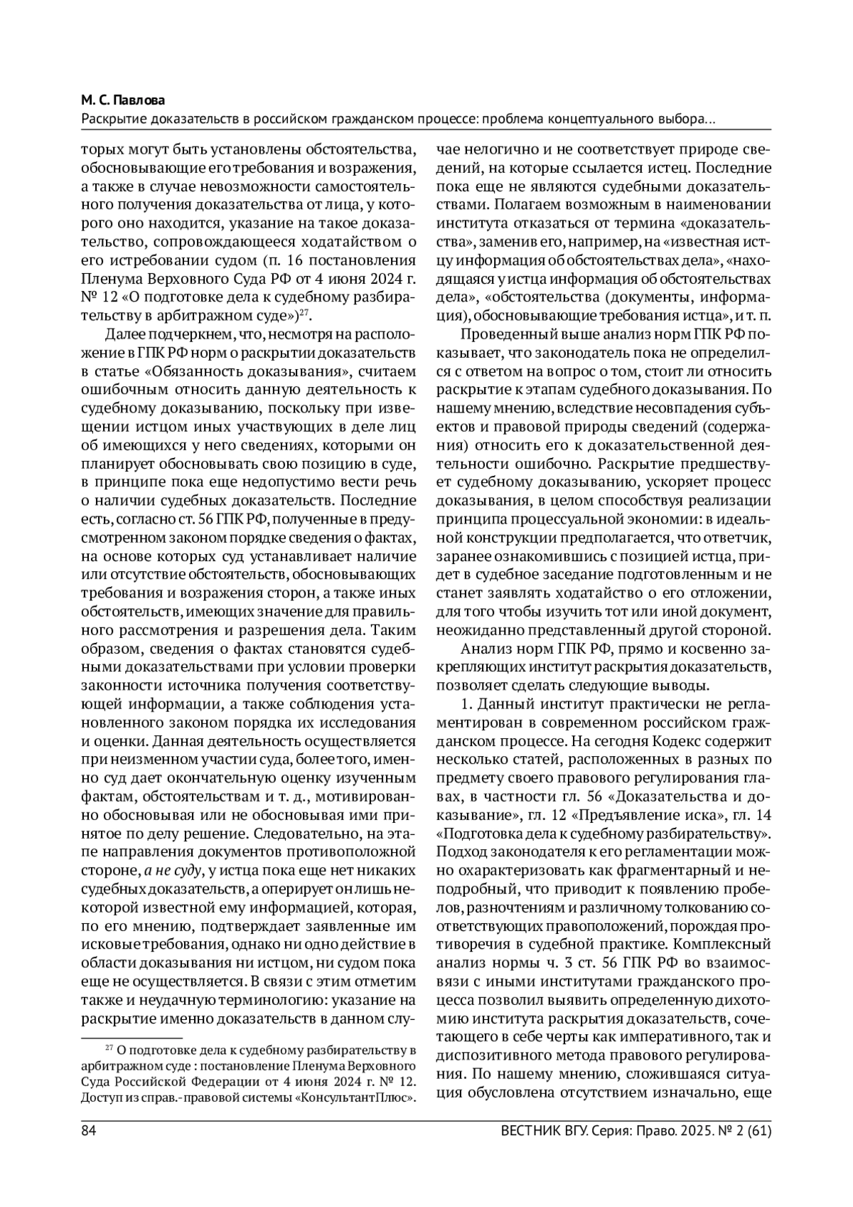 По нашему мнению, наиболее неэффективным и непоследовательным является подход российского законодателя, положенный в основу при введении норм о раскрытии доказательств в орбиту гражданского процесса. В рамках существующей нормативно-правовой формализации в ГПК РФ регулирование института не содействует достижению целей и задач гражданского судопроизводства, в первую очередь, не реализуется задача правильного и своевременного рассмотрения дела. В данном случае речь идет не о формальном определении термина и не о механическом заимствовании зарубежного опыта. Полагаем необходимым, прежде всего, на концептуальном уровне решить вопрос о целесообразности закрепления соответствующих норм в ГПК РФ и месте раскрытия среди институтов процессуального права (принцип процесса, этап судебного доказывания, условие реализации права на иск, правило доказывания, условие допуска судом конкретных сведений в процесс и т. д.), и исходя из этого регламентировать в Кодексе процессуальную форму – конкретный процессуальный порядок, систему совершения последовательных действий, что предполагает определение момента раскрытия с указанием на его императивный / диспозитивный характер, субъектов и объектов (содержание) раскрытия, сроков направления необходимой информации участвующим в деле лицам, возможных неблагоприятных последствий при нарушении порядка раскрытия, видах раскрытия и т. д.