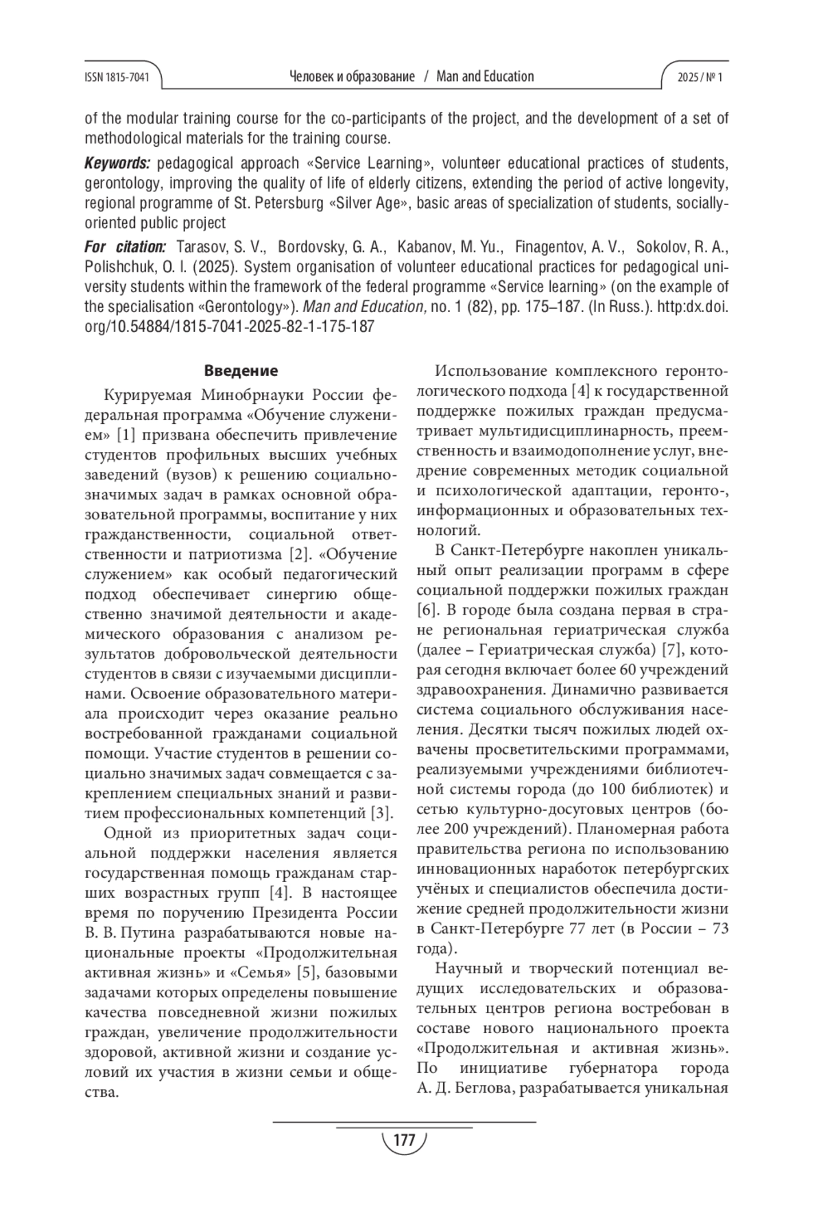 14. Тарасов С. В., Эргашев О. Н., Бордовский Г. А., Финагентов А. В. Концепция создания и развития региональной межведомственной системы информационно-образовательной поддержки пожилых граждан // Человек и образование. 2023. № 1. С. 9-23.