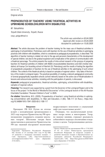 В статье рассматривается проблема подготовки педагогов к массовому использованию театрализованной деятельности в воспитании детей-школьников. Представлено описание подготовительной работы с педагогами к использованию в воспитательных практиках с детьми с ОВЗ театрализованной деятельности, которая рассматривается как педагогическая пропедевтика. Алгоритм подготовки педагогов связан не только с возрастными и личностными особенностями развития особенных детей, но и с постепенным расширением и усложнением сферы общения с театральным персонажем. Приведены результаты внутришкольного исследования процесса подготовки педагогов к театрализованной деятельности детей с НОДА (нарушениями опорно-двигательного аппарата) и ЗПР (задержкой психического развития) в школе-интернате «Красные Зори» в г. Петергоф (Санкт-Петербург) и результаты апробации алгоритма пропедевтической подготовки педагогов к использованию театрализованной деятельности в воспитании таких школьников. Содержание театрализованной деятельности основано на образцах региональной культуры – сказках территории современной Ленинградской области. Обсуждается практическая возможность создания сетевого педагогического сообщества нескольких территориально разобщённых школ (школьная сеть) на основе активного использования театрализации в урочной и внеурочной работе, в т. ч. с участием родителей.