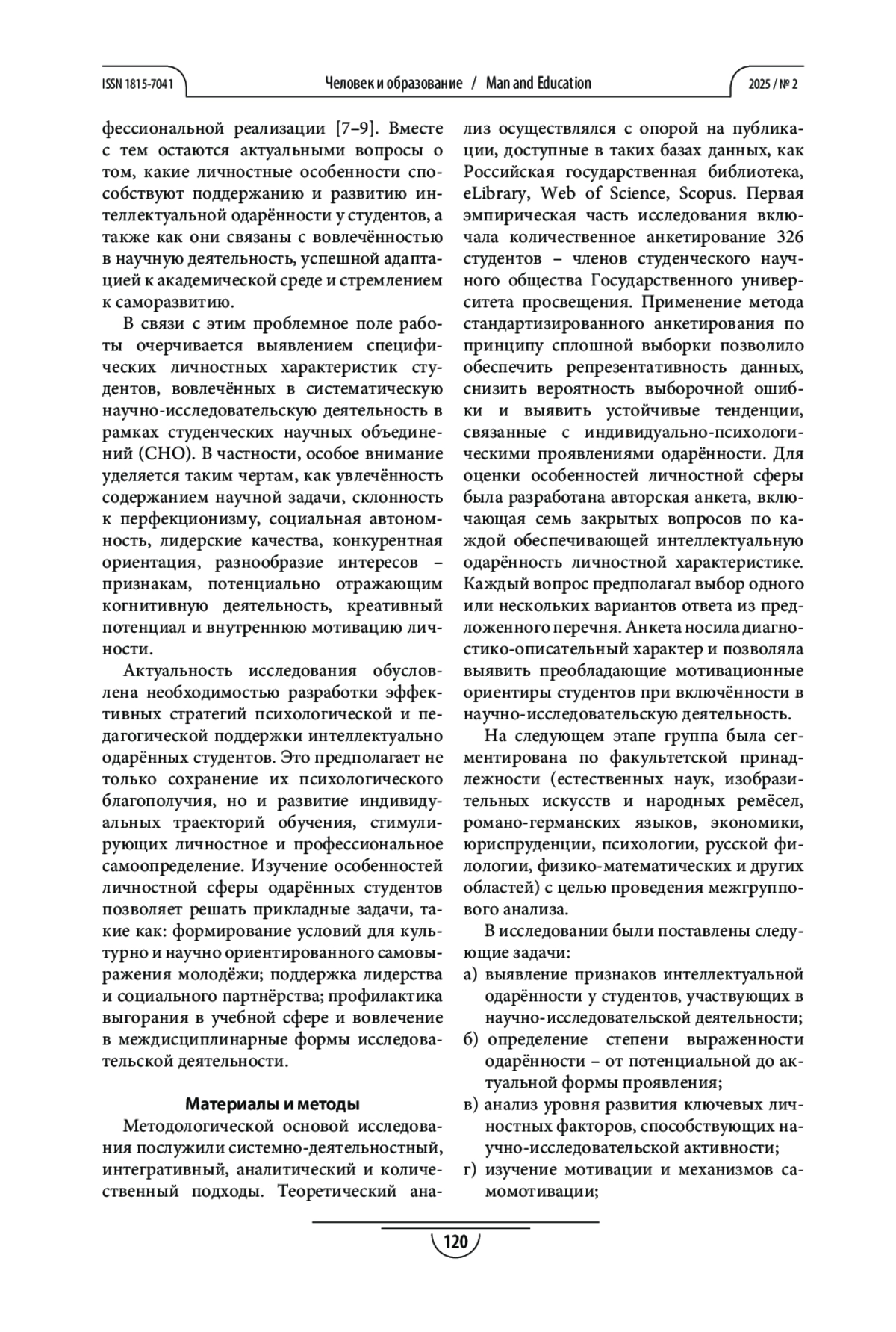 В статье представлены результаты исследования, целью которого является изучение особенностей развития интеллектуальной одарённости студентов в рамках деятельности студенческого научного сообщества. Рассматриваются вопросы проявления отдельных свойств психики, совокупно обеспечивающих развитие интеллектуальной одарённости у студентов, занимающихся научно-исследовательской деятельностью в период их участия в работе студенческого научного сообщества. Данные, собранные из научных публикаций в электронных базах (Российская государственная библиотека, eLibrary, Web of Science и Scopus), служат основой для анализа теоретических аспектов рассматриваемой проблемы. Результатом исследования стало выявление у студентов, занимающихся научно-исследовательской деятельностью в студенческом научном сообществе, уровня развития личностных характеристик, совокупно обеспечивающих степень проявления интеллектуальной одарённости в процессе её развития, признаков наличия как потенциальной, так и актуальной интеллектуальной одарённости, различающихся по степени выраженности. Установлена связь между личностными характеристиками, уровнем мотивации к научно-исследовательской деятельности и проявлениями интеллектуальной одарённости, что позволяет рассматривать участие в научном сообществе как фактор, способствующий её актуализации и развитию. Полученные данные легли в основу практических рекомендаций, направленных на поддержку интеллектуальной одарённости студентов и повышение эффективности деятельности студенческих научных обществ.