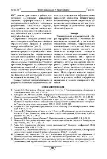 5. Аникина Е.И. Электронное обучение в вузе // Известия Юго-Западного государственного университета. Серия: Управление, вычислительная техника, информатика. Медицинское приборостроение. 2022. № 2-3. С. 59-63.
