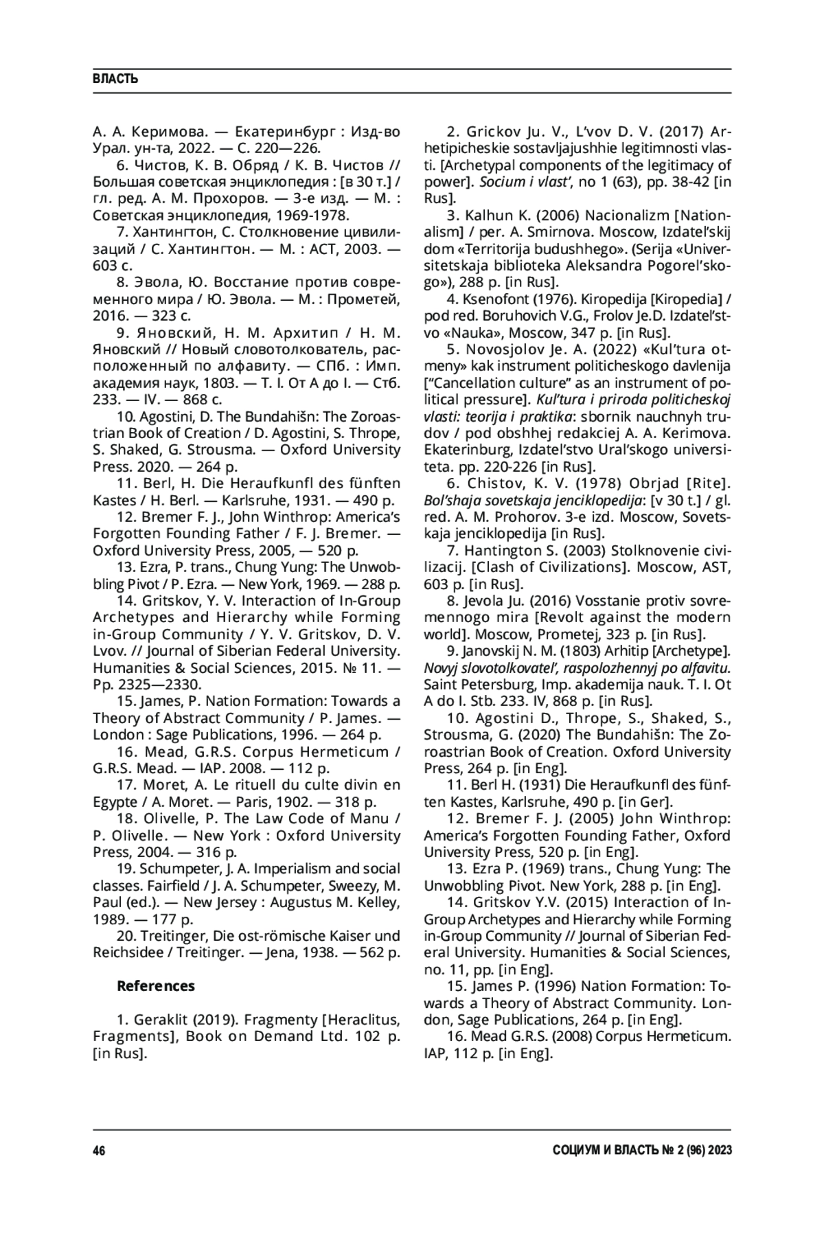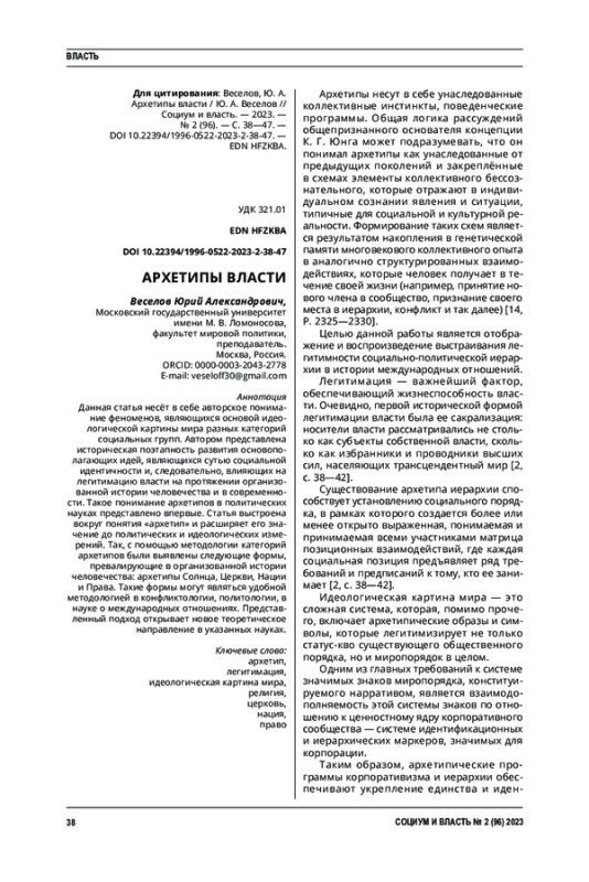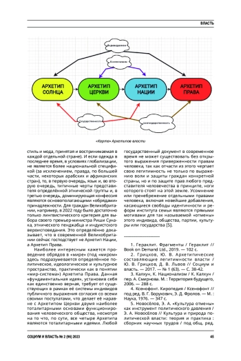 2. Грицков, Ю. В. Архетипические составляющие легитимности власти / Ю. В. Грицков, Д. В. Львов // Социум и власть. - 2017. - № 1 (63). - С. 38-42. EDN: YKROHH