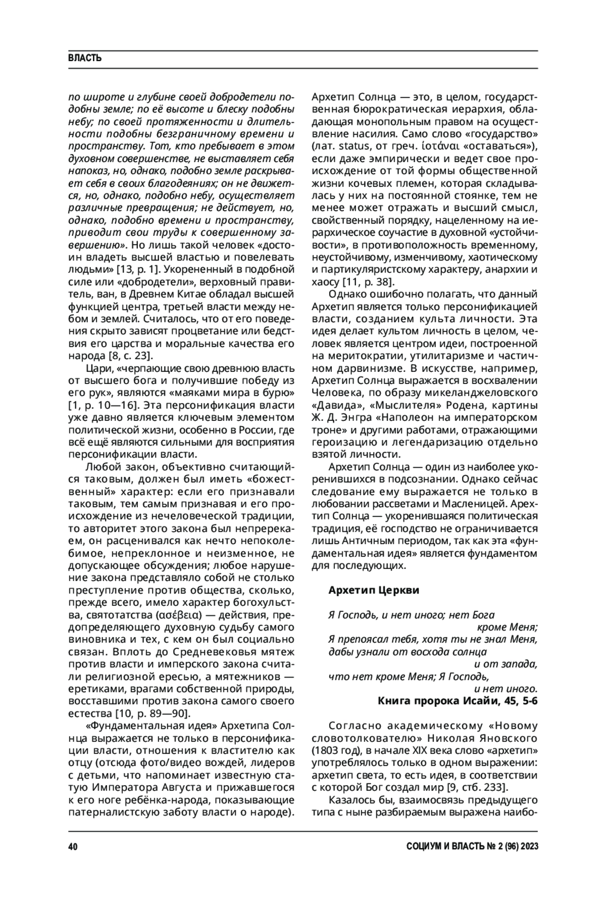 Данная статья несёт в себе авторское понимание феноменов, являющихся основой идеологической картины мира разных категорий социальных групп. Автором представлена историческая поэтапность развития основополагающих идей, являющихся сутью социальной идентичности и, следовательно, влияющих на легитимацию власти на протяжении организованной истории человечества и в современности. Такое понимание архетипов в политических науках представлено впервые. Статья выстроена вокруг понятия «архетип» и расширяет его значение до политических и идеологических измерений. Так, с помощью методологии категорий архетипов были выявлены следующие формы, превалирующие в организованной истории человечества: архетипы Солнца, Церкви, Нации и Права. Такие формы могут являться удобной методологией в конфликтологии, политологии, в науке о международных отношениях. Представленный подход открывает новое теоретическое направление в указанных науках.