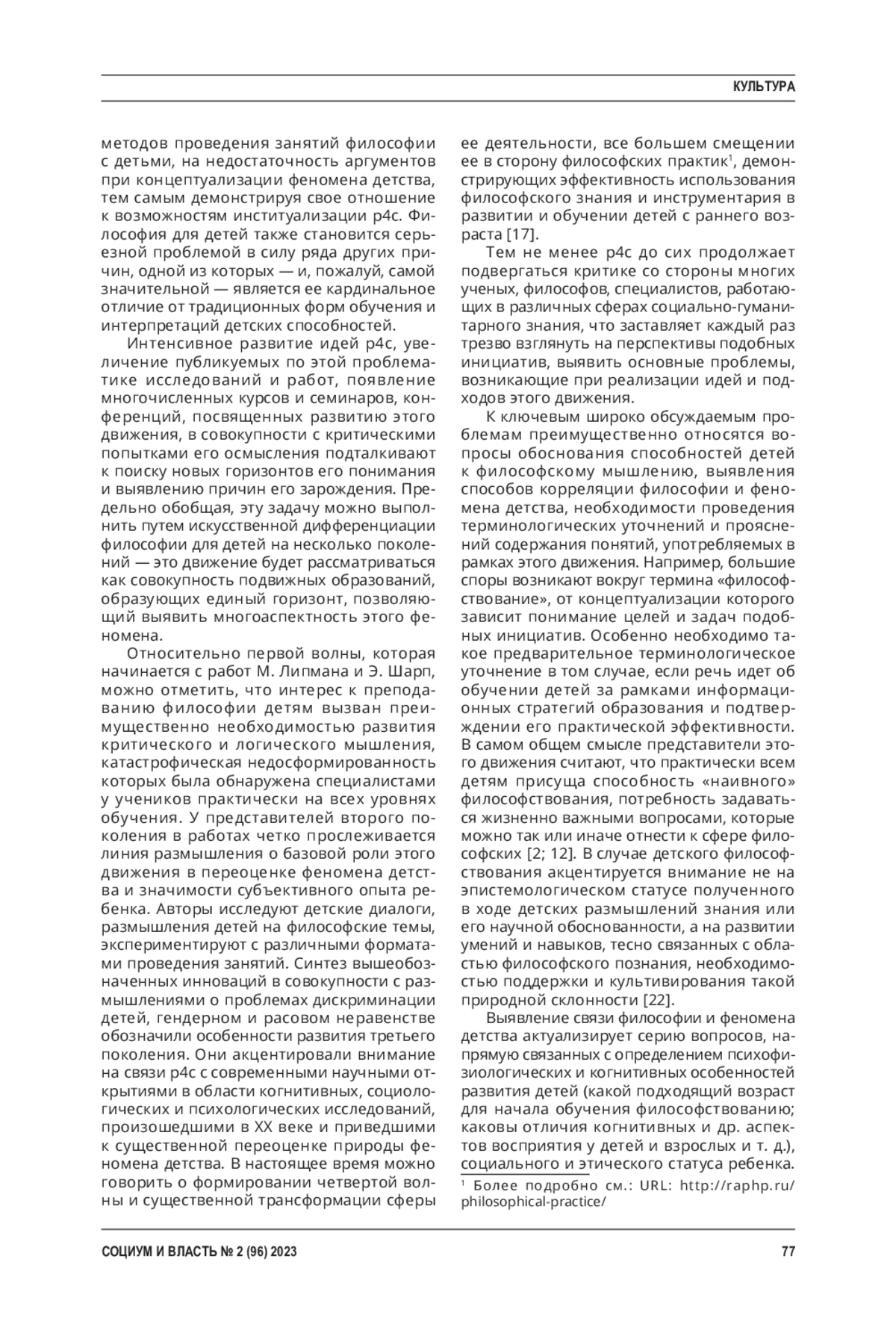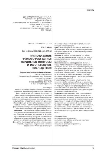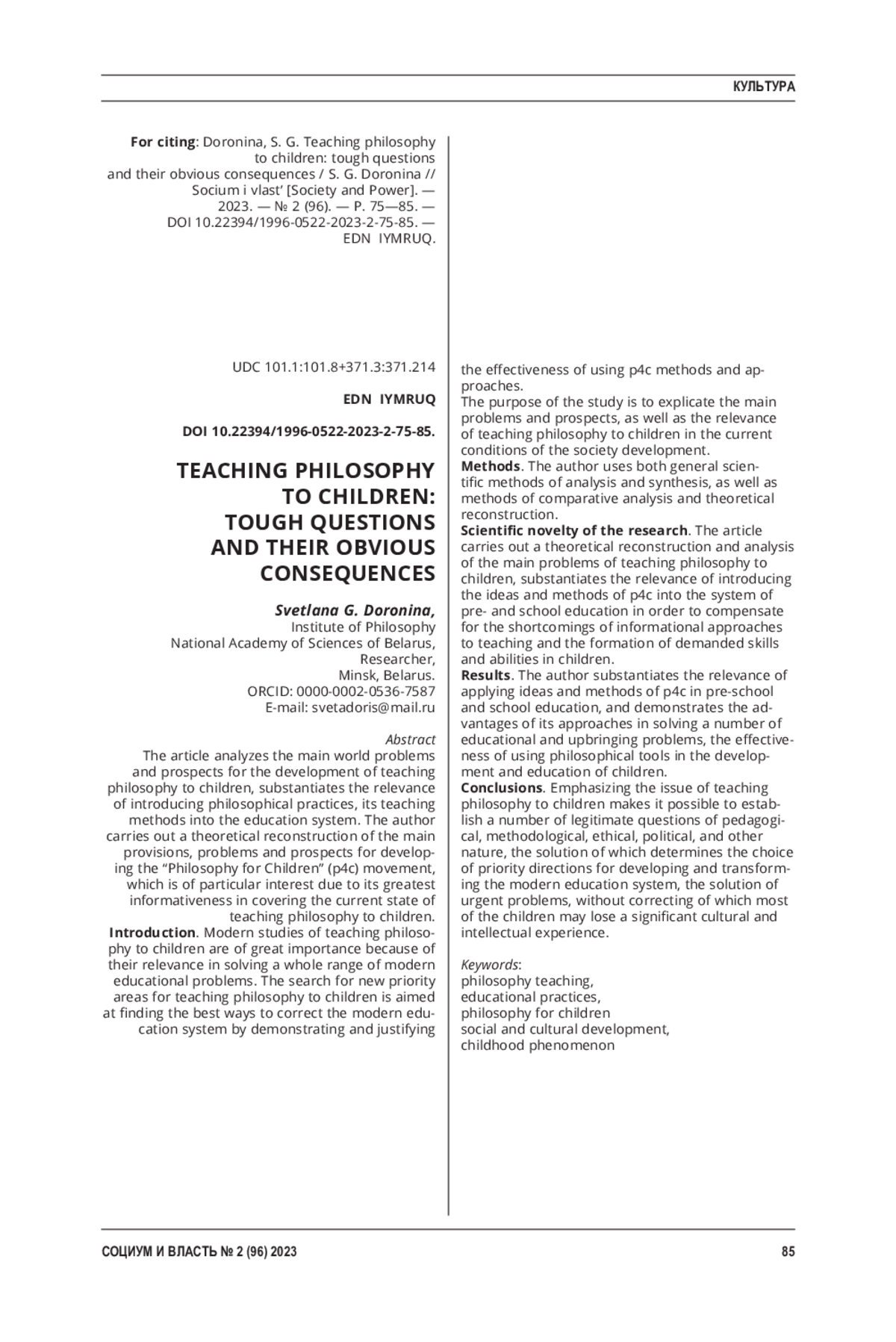 ДОРОНИНА С. Г. ПРЕПОДАВАНИЕ ФИЛОСОФИИ ДЕТЯМ: НЕУДОБНЫЕ ВОПРОСЫ И ИХ ОЧЕВИДНЫЕ ПОСЛЕДСТВИЯ // СОЦИУМ И ВЛАСТЬ. 2023. № 2 (96)