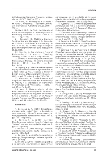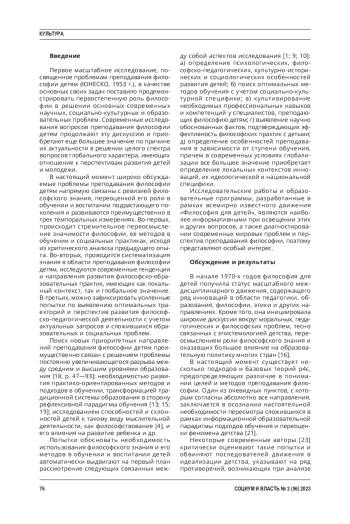 Введение. Современные исследования вопросов преподавания философии детям приобретают большое значение по причине их актуальности в решении целого спектра современных образовательных проблем. Поиск новых приоритетных направлений преподавания философии детям преследует цель найти оптимальные способы коррекции современной системы образования путем демонстрации обоснования эффективности использования методов и подходов p4c.