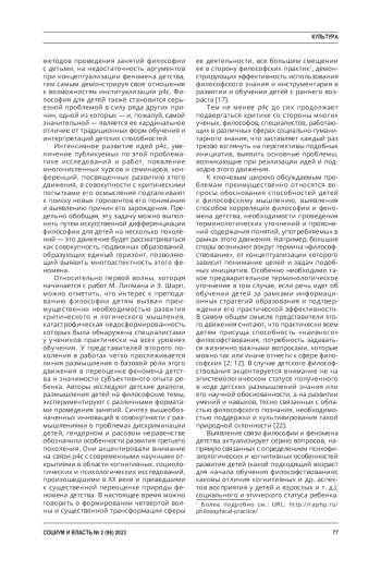 Методы. В работе использованы как общенаучные методы анализа и синтеза, так и методы компаративного анализа и теоретической реконструкции. Научная новизна исследования. В статье осуществлена теоретическая реконструкция и проведен анализ основных проблем преподавания философии детям, обоснована актуальность внедрения идей и методов p4c в систему до- и школьного образования с целью компенсировать недостатки информационных подходов обучения и формирования у детей востребованных навыков и умений.