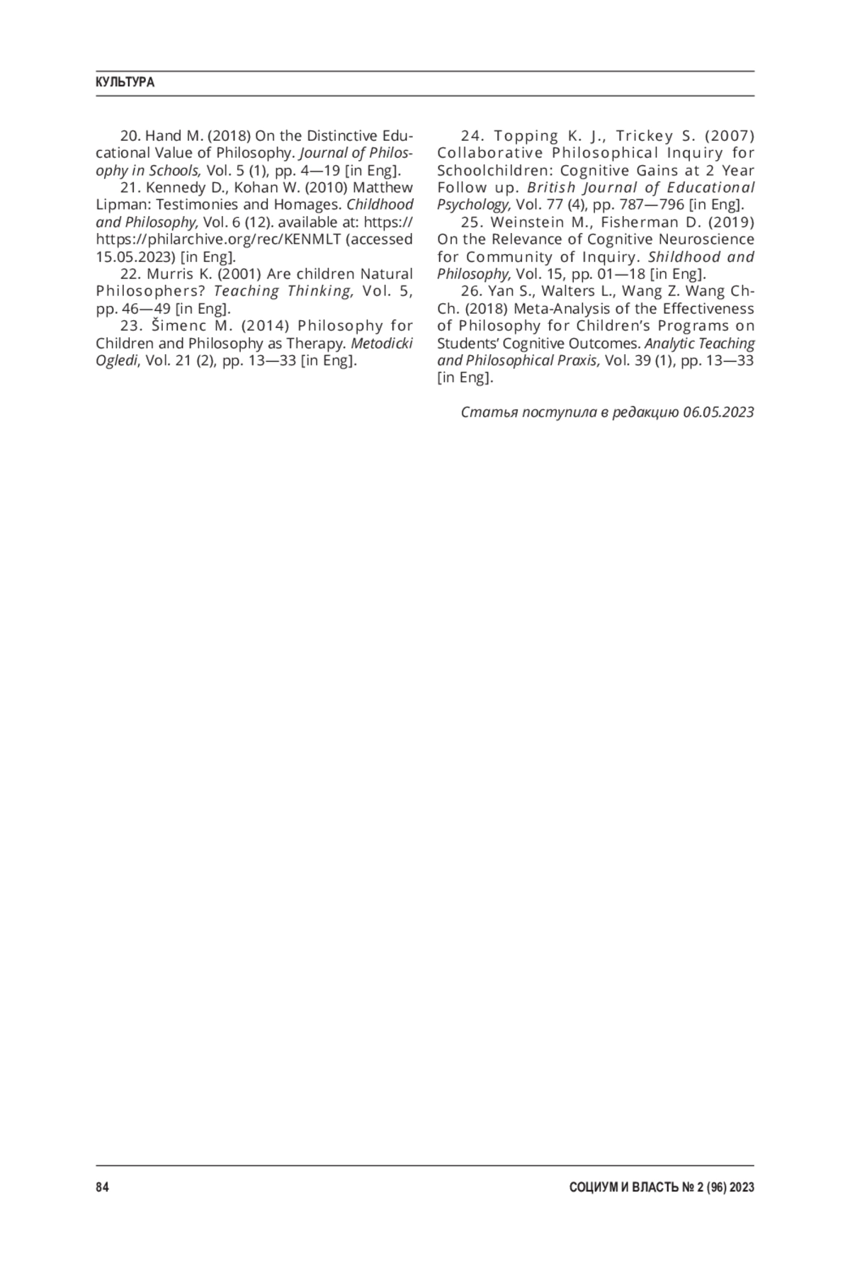 Статья: ПРЕПОДАВАНИЕ ФИЛОСОФИИ ДЕТЯМ: НЕУДОБНЫЕ ВОПРОСЫ И ИХ ОЧЕВИДНЫЕ ПОСЛЕДСТВИЯ (2023)
