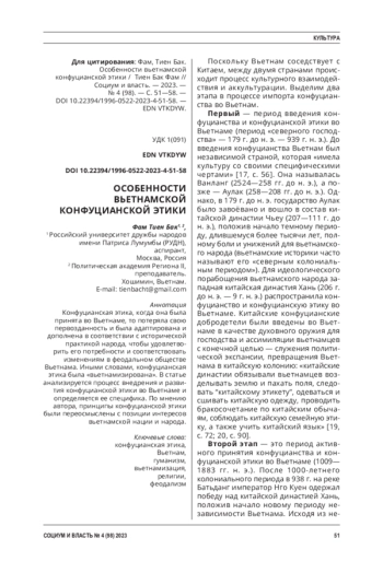 Конфуцианская этика, когда она была принята во Вьетнаме, то потеряла свою первозданность и была адаптирована и дополнена в соответствии с исторической практикой народа, чтобы удовлетворить его потребности и соответствовать изменениям в феодальном обществе Вьетнама. Иными словами, конфуцианская этика была «вьетнамизирована». В статье анализируется процесс внедрения и развития конфуцианской этики во Вьетнаме и определяется ее специфика. По мнению автора, принципы конфуцианской этики были переосмыслены с позиции интересов вьетнамской нации и народа.