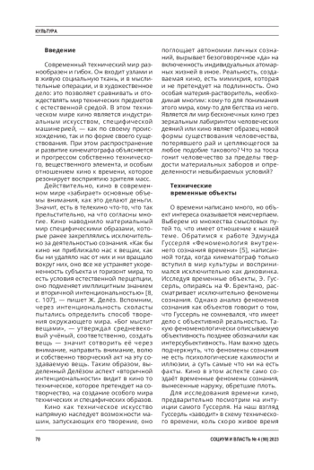 Современный технический мир разнообразен и гибок. Он входит узлами и в живую социальную ткань, и в мыслительные операции, и в художественное дело: это позволяет сравнивать и ото - ждествлять мир технических предметов с естественной средой. В этом техни - ческом мире кино является индустриальным искусством, специфической машинерией, — как по своему происхождению, так и по форме своего существования. При этом распространение и развитие кинематографа объясняется и прогрессом собственно технического, вещественного элемента, и особым отношением кино к времени, которое резонирует восприятию зрителя масс
