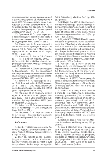 Выводы. Кино растворяет любую эмпирическую плотность, создавая в ней лакуны и переходы в иные миры. Связь между мирами осуществляет сконструированное время. Время вынимается из объектов и, подчиняясь ходу повествования, расширяет реальность мира. Так появляется виртуальность.