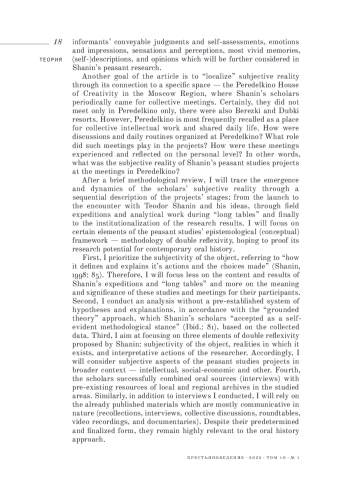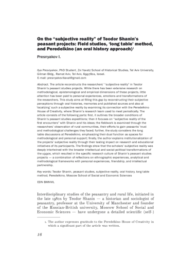 The article reconstructs the researchers’ “subjective reality” in Teodor Shanin’s peasant studies projects. While there has been extensive research on methodological, epistemological and empirical dimensions of these projects, little attention has been paid to personal experiences, emotions and transformations of the researchers. This study aims at filling this gap by reconstructing their subjective perceptions through oral histories, memories and published sources and also at ‘localizing’ such a subjective reality by examining its connection with the Peredelkino House of Creativity, where Shanin’s research team used to meet periodically. The article consists of the following parts: first, it outlines the broader conditions of Shanin’s peasant studies expeditions; then it focuses on “subjective reality of the first encounters” with Shanin and his ideas; the fieldwork is examined through the researchers’ observation of rural communities, their efforts to gain peasants’ trust and methodological challenges they faced; further, the study considers the long table discussions at Peredelkino, emphasizing their dual function as spaces for methodological and personal support; finally, the author explains institutionalization of the projects’ subjective reality through their lasting impact on research and educational initiatives of its participants. The findings show that the scholars’ subjective reality was deeply intertwined with the broader intellectual and social-political transformations of the 1990s, which resulted in the specific research culture of Shanin’s peasant studies projects - a combination of reflections on ethnographic experiences, analytical and methodological frameworks with personal experiences, friendship, and intellectual partnership.