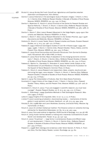 30. Shanin T. (2002) Reflexive sociology and the Russian village. Reflexive Peasant Studies: A Decade of Studies of Rural Russia. T. Shanin, A. Nikulin, V. Danilov (Eds.), Moscow: MSSES, ROSSPEN, pp. 9-30. (In Russ.).