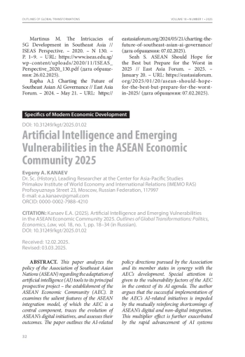 В работе проведен анализ политики Ассоциации стран Юго-Восточной Азии (АСЕАН) по адаптации инструментов искусственного интеллекта (ИИ) к своему основному перспективному проекту – формированию Экономического сообщества (ЭС) АСЕАН. Рассмотрены особенности интеграционной модели АСЕАН, частью которой стал проект ЭС, раскрыта эволюция цифровых инициатив АСЕАН, дана оценка итогам их реализации. Определены направления политики Ассоциации и входящих в нее стран в отношении искусственного интеллекта в ее увязке с потребностями формирования ЭС АСЕАН. Особое внимание уделено выявлению факторов уязвимости этого проекта в контексте развития его ИИ-повестки. Сделан вывод, что успешное внедрение ИИ-практик в сотрудничество государств Ассоциации в контексте формирования Экономического сообщества затруднено взаимным влиянием пробелов нецифровой и цифровой интеграции АСЕАН с мультиплицирующим эффектом, усугубленным быстрым развитием ИИ-систем и ИИ-технологий, а также неспособностью Ассоциации развивать ИИ-повестку ЭС АСЕАН в условиях неготовности к этому ее стран-участниц. По мнению автора, АСЕАН находится в состоянии стратегического цугцванга, поскольку как форсированное развитие ИИ-повестки, так и попытка поставить это направление на паузу приведет к нарастанию ее зависимости от внерегиональных партнеров. Исследование базируется на междисциплинарном подходе с интеграцией общенаучных, частно-научных и дисциплинарных методов. Поскольку данная тема именно в таком исследовательском ракурсе не была предметом специального рассмотрения в отечественном и зарубежном научном сообществе, а обращение к ее отдельным аспектам носит спорадический и фрагментарный характер, статья имеет очевидную научную новизну, актуальность и практическую значимость.