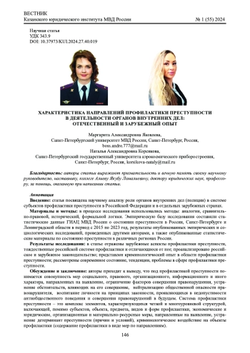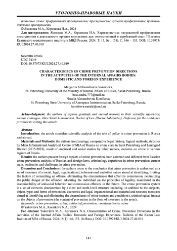 Результаты исследования: в статье отражены зарубежные аспекты профилактики преступности, тождественные российской системе профилактики и отличающиеся от нее; проанализировано российское и зарубежное законодательство; представлен криминологический опыт в области профилактики преступности; рассмотрены современное состояние, тенденции, проблемы в сфере профилактики преступности.