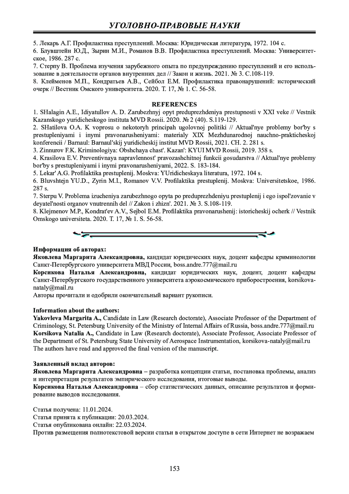 7. Стерпу В. Проблема изучения зарубежного опыта по предупреждению преступлений и его использование в деятельности органов внутренних дел // Закон и жизнь. 2021. № 3. С.108-119.