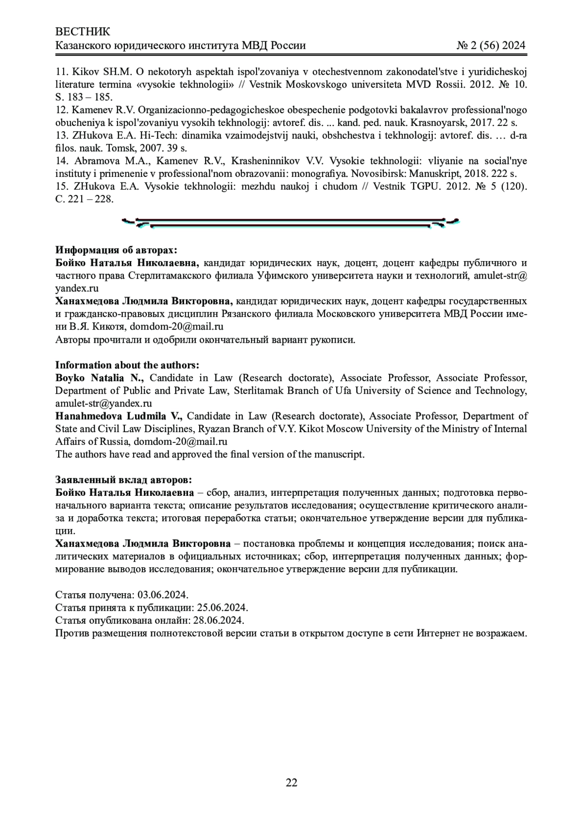 11. Киков Ш.М. О некоторых аспектах использования в отечественном законодательстве и юридической литературе термина “высокие технологии” // Вестник Московского университета МВД России. 2012. № 10. С. 183 - 185. EDN: PXKPCT