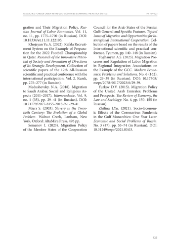 5. Семёнов И.А. Миграционная поли-тика стран - членов Совета сотрудничества арабских государств Персидского залива: общие и специфические черты // Актуальные вопросы миграции и возможности межрегионального международного сотрудничества : сборник статей по результатам Международной научно-практической конференции. - Тюмень, 2023. - С. 140-148.