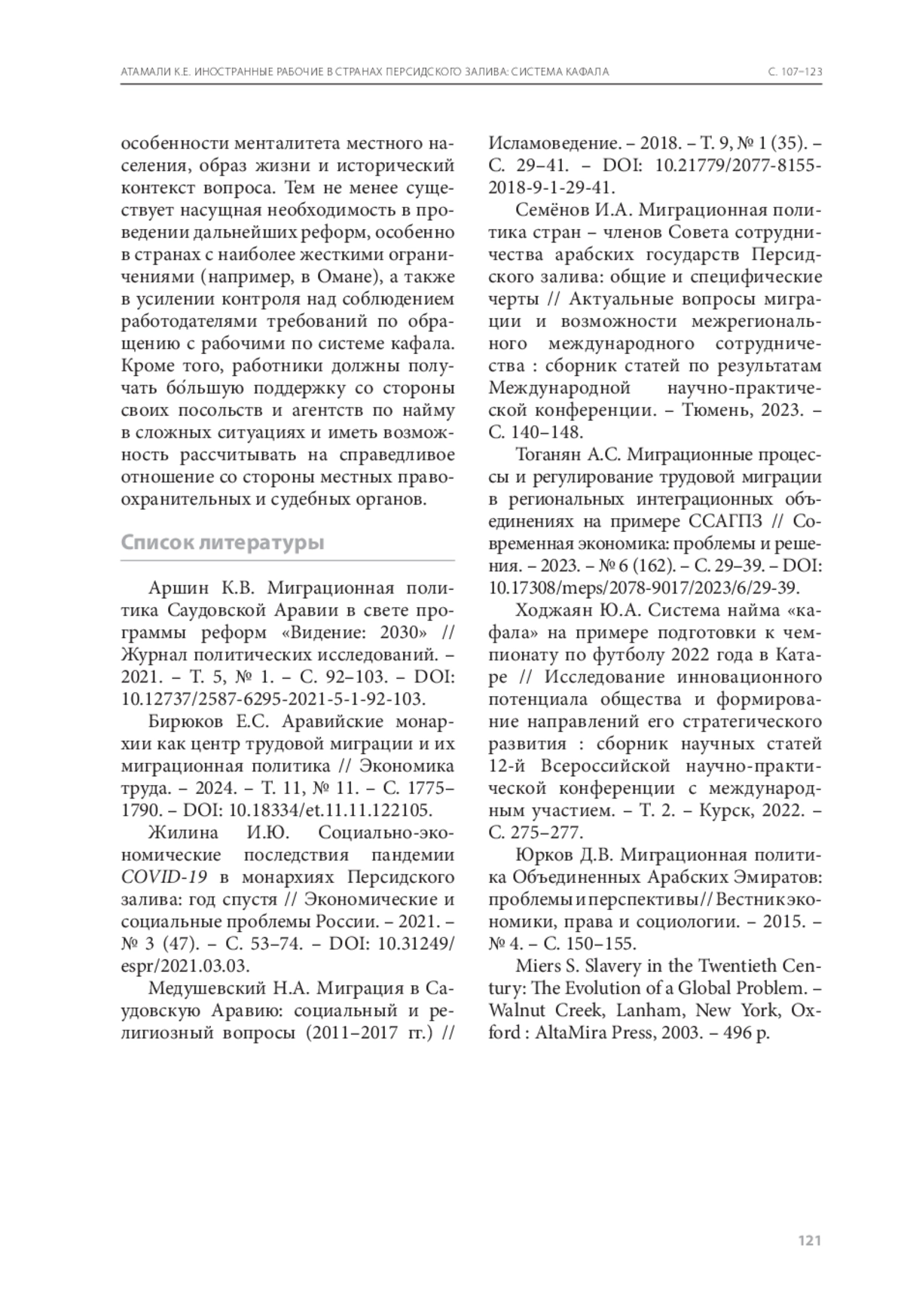 2. Бирюков Е.С. Аравийские монархии как центр трудовой миграции и их миграционная политика // Экономика труда. - 2024. - Т. 11, № 11. - С. 1775-1790. - https://doi.org/10.18334/et.11.11.122105.