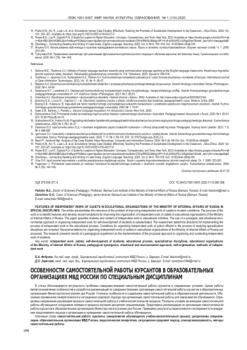 В статье обосновывается актуальность проблемы совершенствования самостоятельной работы курсантов в современных условиях. Целью работы является выявление особенностей и разработка рекомендаций по совершенствованию организации самостоятельной работы курсантов в образовательных организациях Министерства внутренних дел России. Уточнены особенности и содержание самостоятельной работы в образовательной деятельности. Обосновано применение синергетического и ситуационно-средового подхода при организации самостоятельной работы для саморазвития обучающихся. Определены направления реализации процесса самостоятельной работы в учебно-воспитательном процессе. Раскрыты условия организации самостоятельной работы обучающихся сотрудников полиции в процессе изучения дисциплин специализации. Предложены рекомендации по организации самостоятельной работы курсантов в образовательных организациях Министерства внутренних дел России. Приведены результаты педагогического эксперимента по внедрению предлагаемого подхода к организации и проведению самостоятельной работы обучающихся.