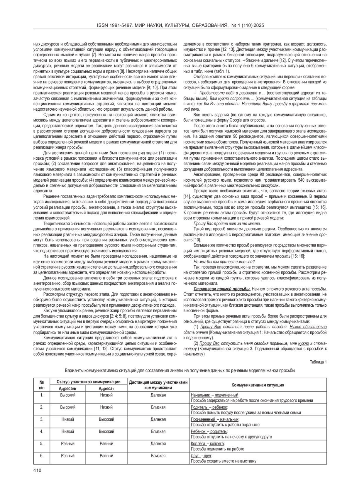 Актуальность исследования определяется рядом факторов. Начиная со второй половины прошлого века, ознаменованной зарождением прагматического ответвления и появлением теории вежливости [1], процесс коммуникативной реализации просьбы вызывает особый интерес отечественных и зарубежных ученых из различных сфер гуманитарных наук, включая лингвистику, социологию и психологию [1–5].