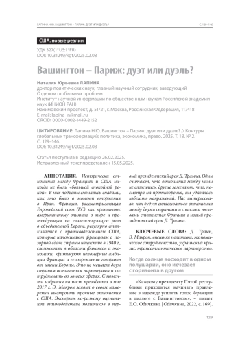 Исторически отношения между Францией и США никогда не были «большой спокойной рекой». В них подъемы сменялись спадами, как это было в момент вторжения в Ирак. Франция, рассматривающая Европейский союз (ЕС) как противовес американскому влиянию в мире и претендующая на главенствующую роль в объединенной Европе, регулярно сталкивается с противодействием США, которые напоминают французам о позорной сдаче страны нацистам в 1940 г., сложностях в области финансов и экономики, критикуют непомерные амбиции Франции и ее стремление говорить от имени Европы. Это не мешает двум странам оставаться партнерами и сотрудничать во многих сферах. C момента избрания на пост президента в мае 2017 г. Э. Макрон заявил о своем намерении выстроить прочные отношения с США. Эксперты по‑разному оценивают взаимодействие политиков в первый президентский срок Д. Трампа. Одни считают, что отношения между ними не сложились, другие замечают, что, несмотря на противоречия, им удавалось избегать напряжений. Нас интересовало, как будут складываться отношения между двумя странами и с какими вызовами столкнется Франция в новый президентский срок Д. Трампа.