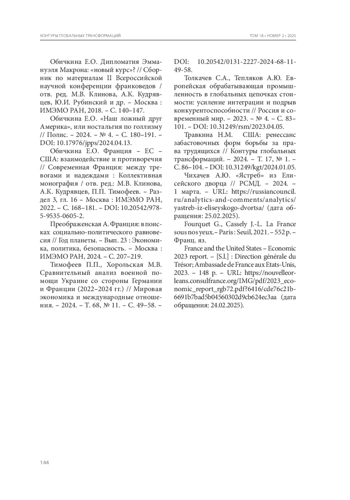 3. Обичкина Е.О. Внешняя политика Эммануэля Макрона: поиски геополитической стратегии в разладившейся мировой иерархии // Актуальные проблемы Европы. - 2021. - № 3. - С. 235- 274. - https://doi.org/10.31249/ape/2021.03.10.