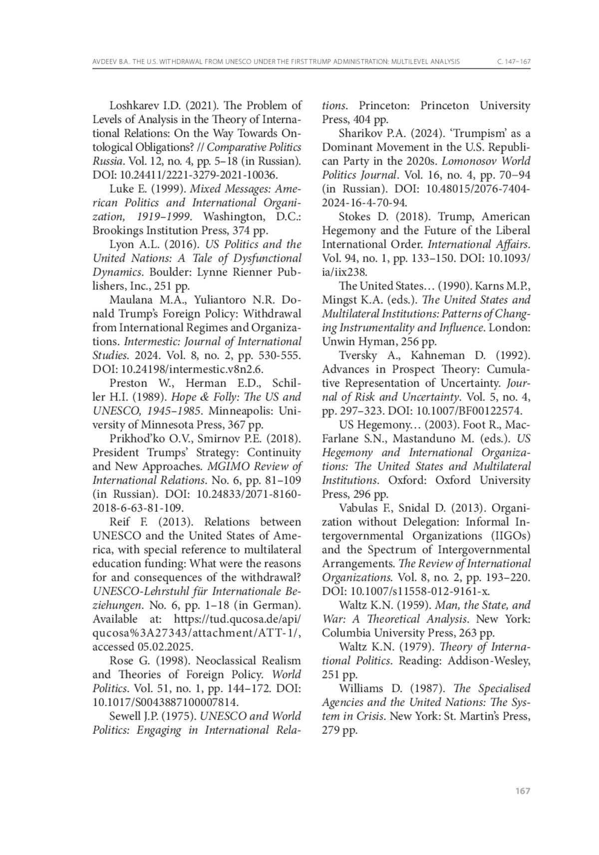 1. Авдеев Б.А. Выход США из ЮНЕСКО при администрации Р. Рейгана: многоуровневый анализ // Вестник Московского университета. Серия XXV. Международные отношения и мировая политика. - 2024. - Т. 16, № 4. - С. 169- 224. - https://doi.org/10.48015/2076-7404-2024-16-4-169-224.