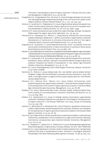 8. Киселев С. В., Кудрявцев Н. Р. (2023). Рынок органической сельскохозяйственной продукции: перспективы и факторы развития в условиях новой реальности // АПК: экономика, управление. № 3. С. 71-78.