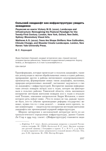 Рецензия на книги: Vickery M. B. (2020). Landscape and Infrastructure: Reimagining the Pastoral Paradigm for the Twenty-First Century. London, New York, Oxford, New Delhi, Sydney: Bloomsbury Visual Arts. Mathews A. S. (2022). Trees Are Shape Shifters: How Cultivation, Climate Change, and Disaster Create Landscapes. London, New Haven: Yale University Press.