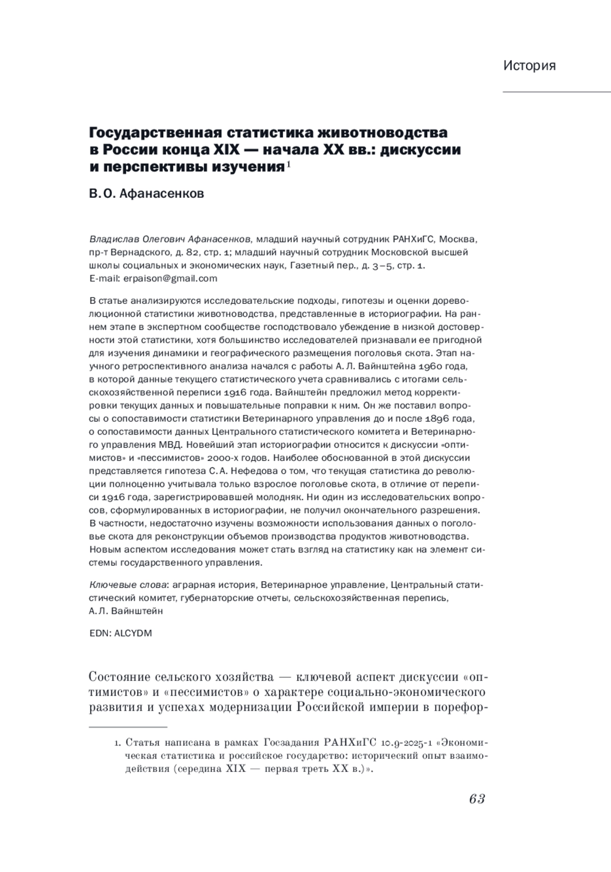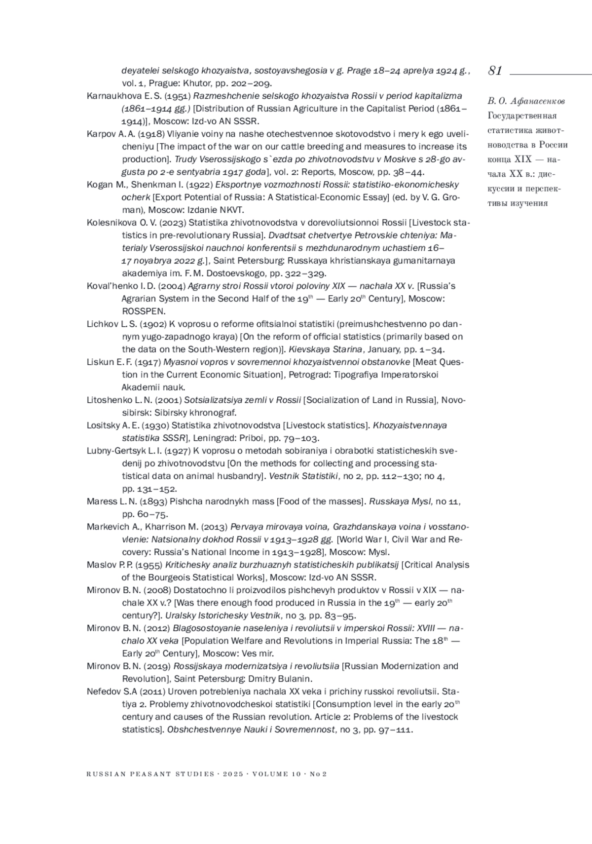 4. Афанасенков В. О. (2023). Статистика животноводства Ветеринарного отделения (управления) МВД: к вопросу о скачкообразном увеличении значений в 1896 г. // Отечественная официальная статистика: прошлое, настоящее, будущее: Сборник материалов Международной научной конференции. М.: Русайнс. С. 11-23. EDN: KBCCWL