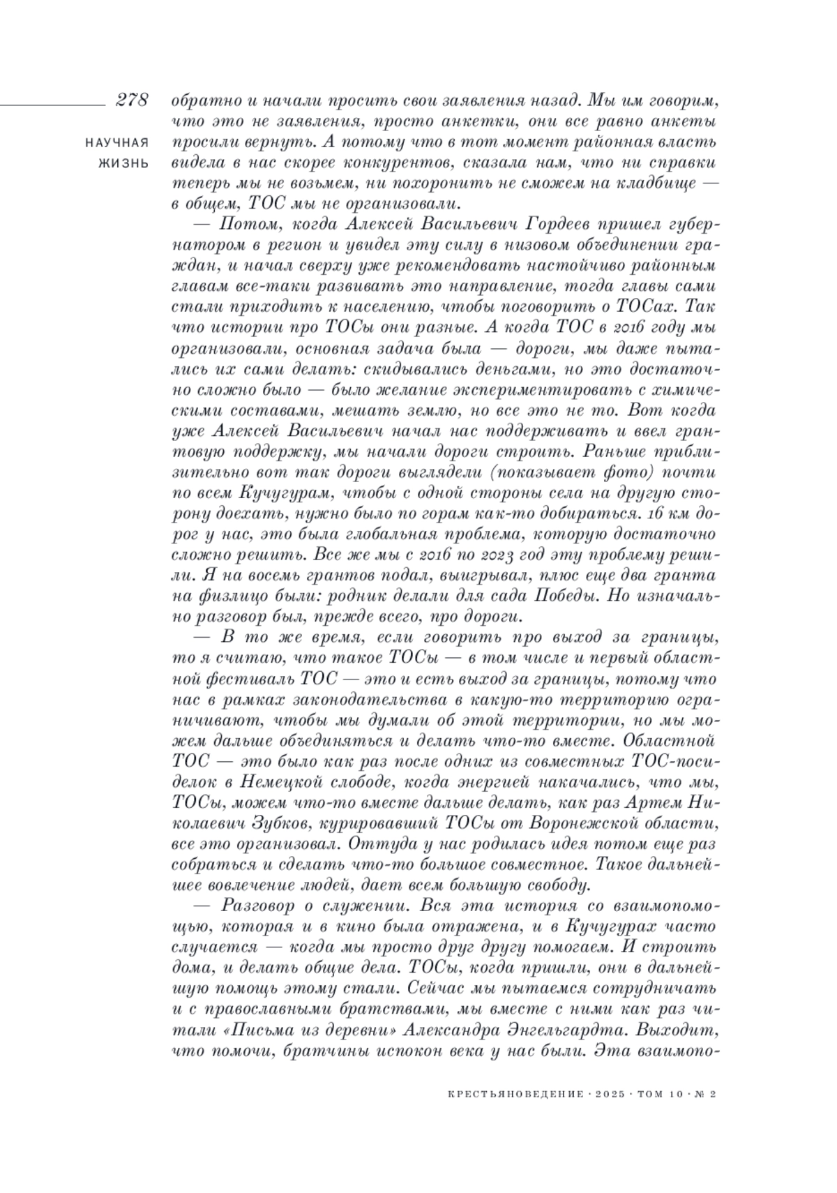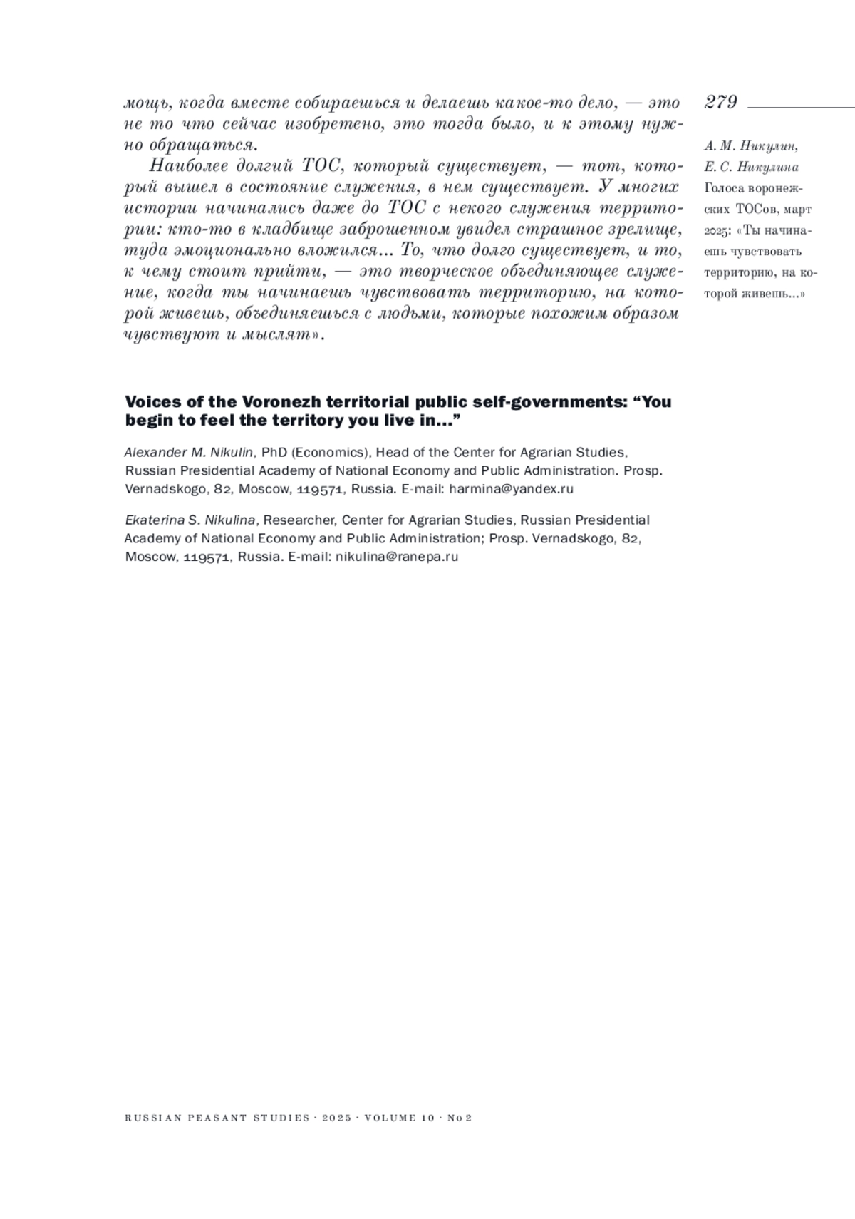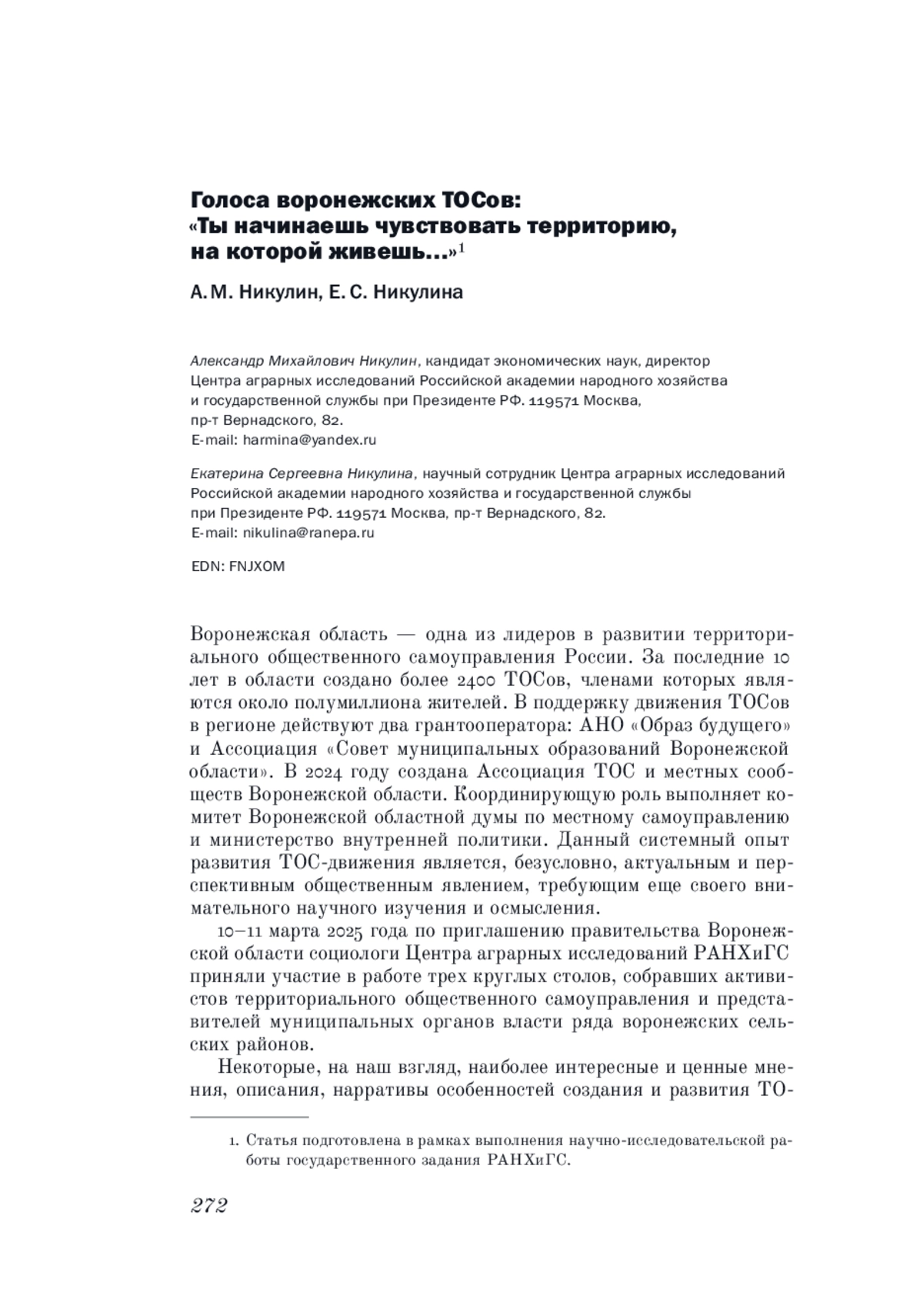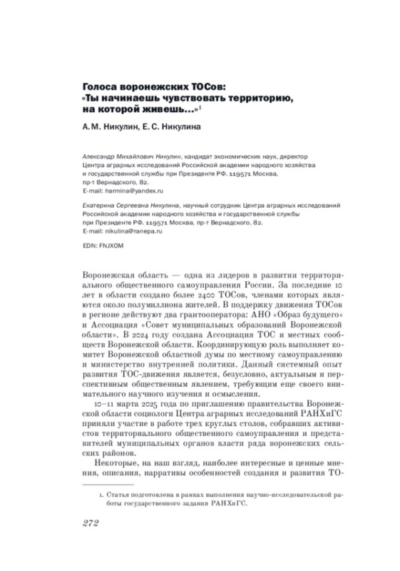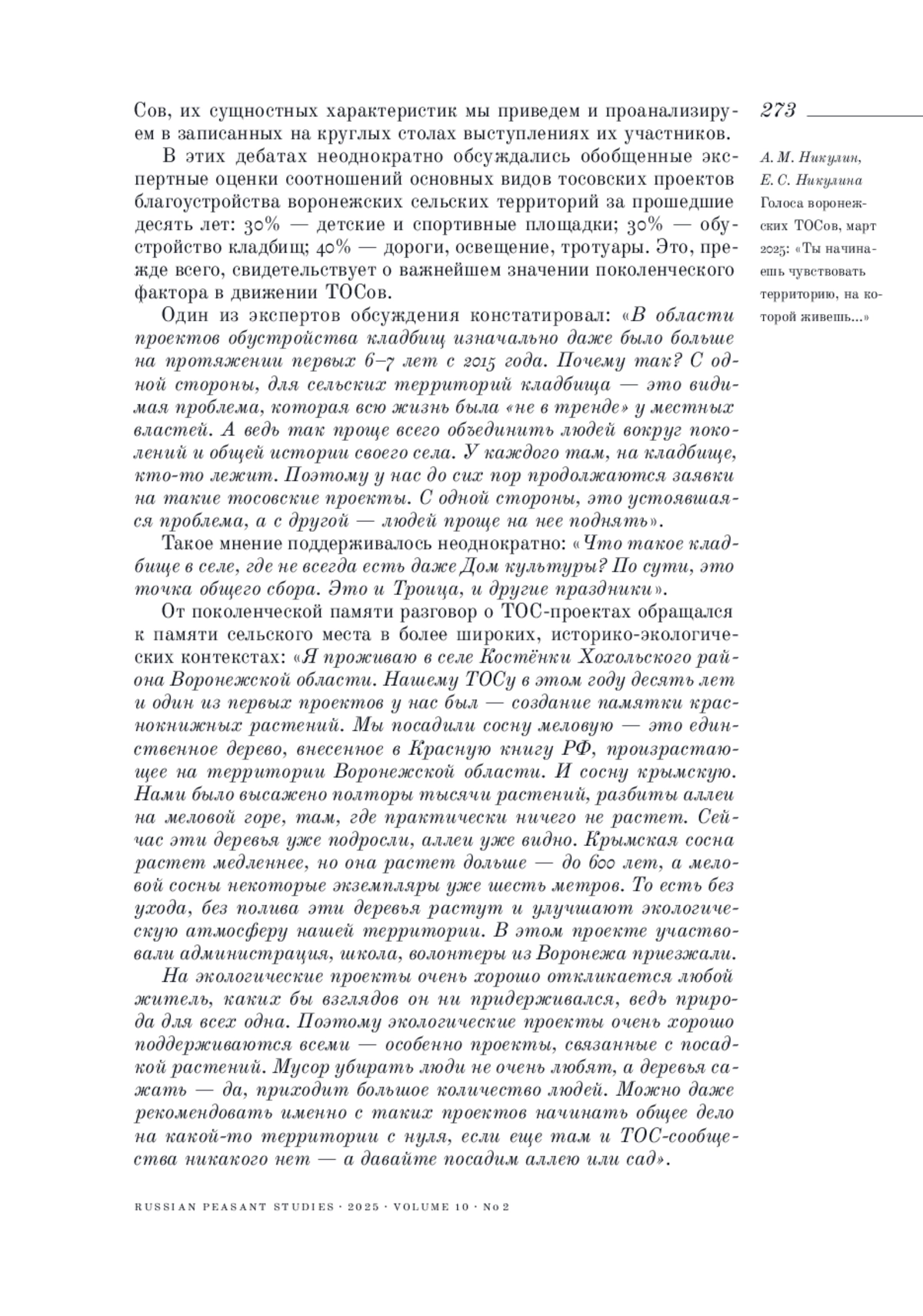 НИКУЛИН А. М., НИКУЛИНА Е. С. ГОЛОСА ВОРОНЕЖСКИХ ТОСОВ: «ТЫ НАЧИНАЕШЬ ЧУВСТВОВАТЬ ТЕРРИТОРИЮ, НА КОТОРОЙ ЖИВЕШЬ...» // КРЕСТЬЯНОВЕДЕНИЕ. 2025. Т. 10 № 2
