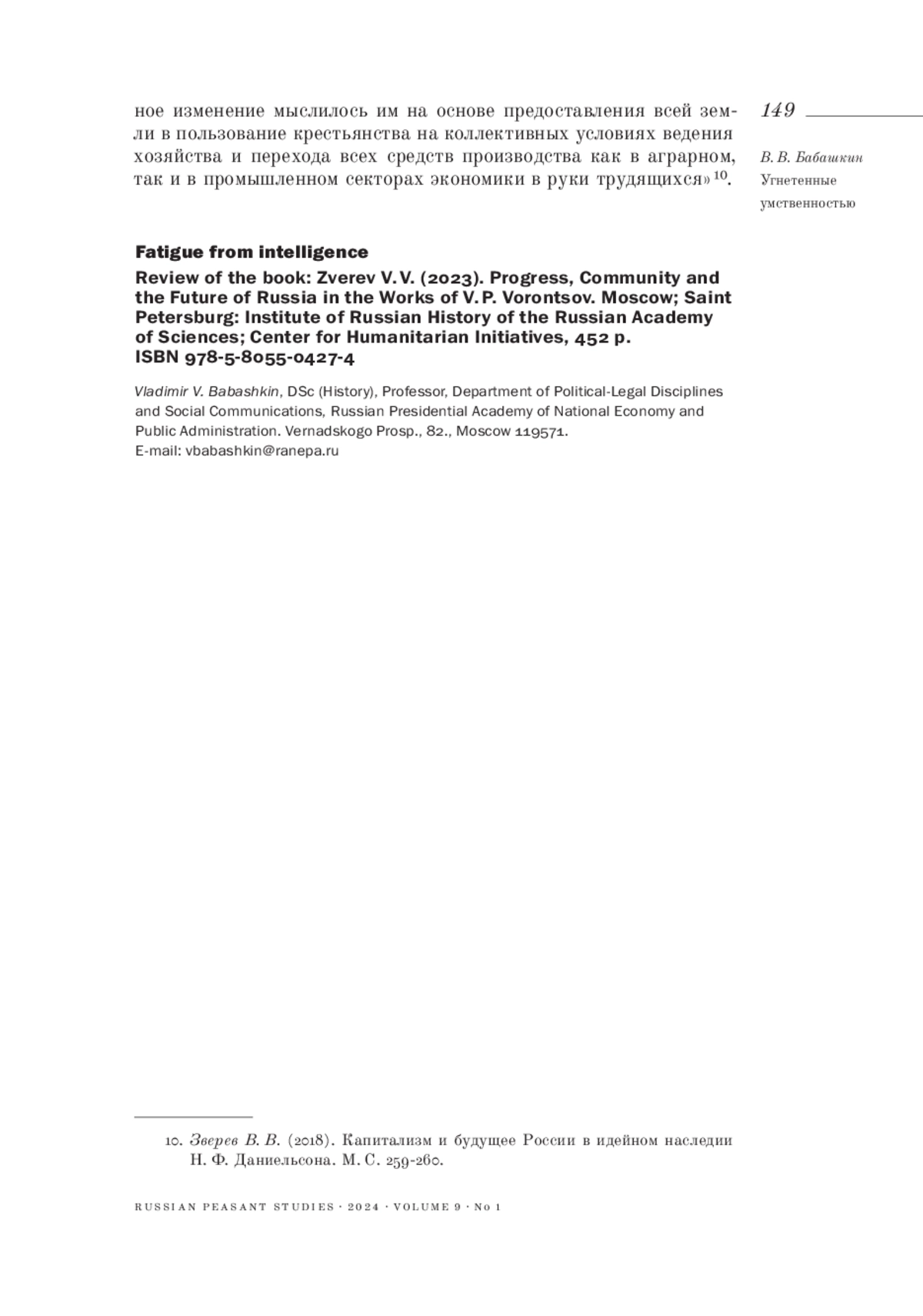 Рецензия на книгу: Зверев В. В. (2023). Прогресс, община и будущее России в творчестве В. П. Воронцова. М.; СПб.: Ин-т рос. истории Рос. акад. наук; Центр гуманитарных инициатив. - 452 с. ISBN 978-5-8055-0427-4
