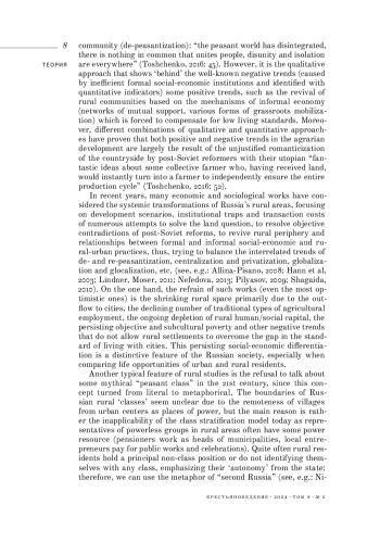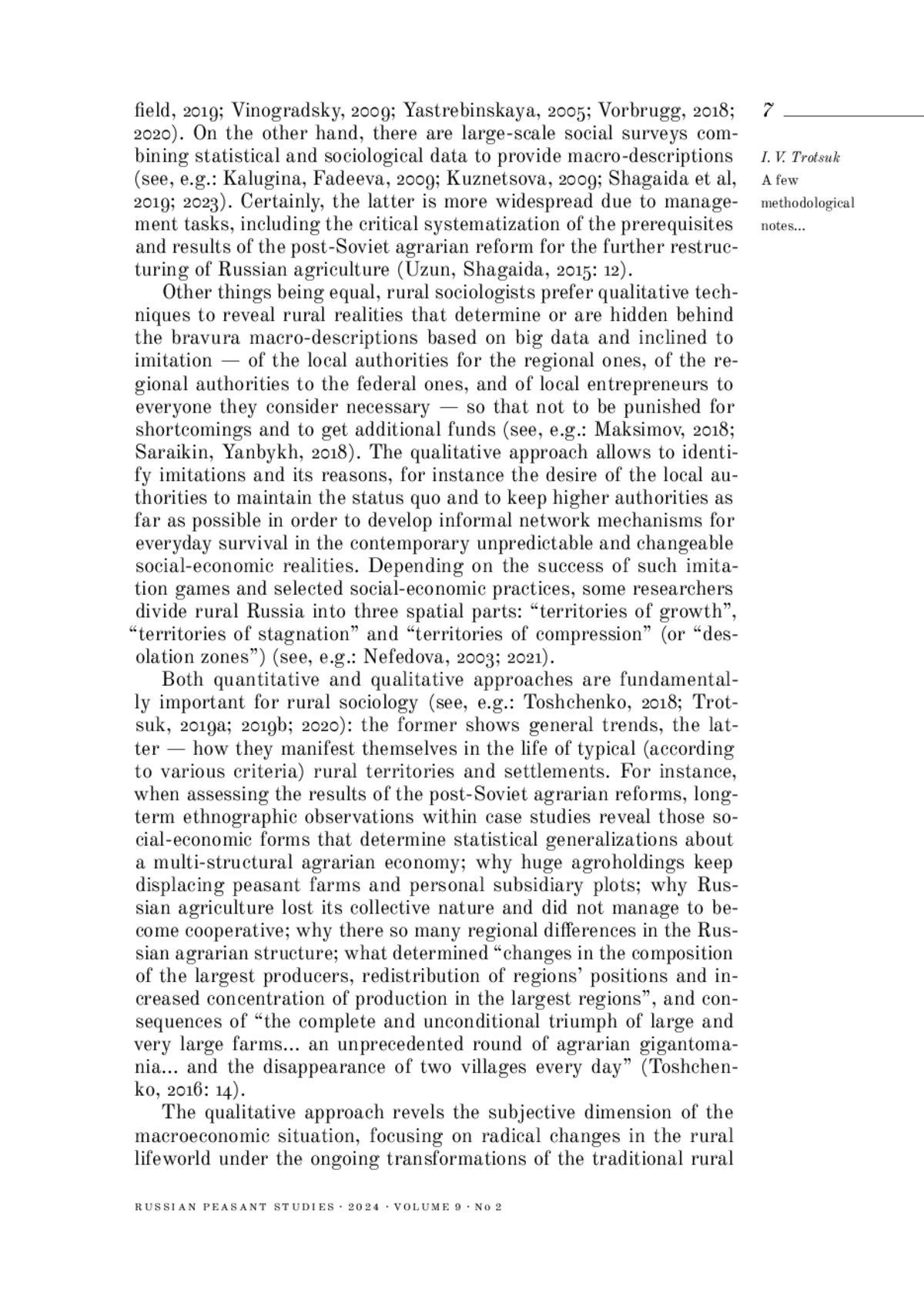 The Russian tradition of peasant/rural studies can be divided into two conditional parts. On the one hand, there are sociological/ethnographic observations of local rural realities based (see, e. g.: Banfield, 2019; Vinogradsky, 2009; Yastrebinskaya, 2005; Vorbrugg, 2018; 2020). On the other hand, there are large-scale social surveys combining statistical and sociological data to provide macro-descriptions (see, e. g.: Kalugina, Fadeeva, 2009; Kuznetsova, 2009; Shagaida et al, 2019; 2023). Certainly, the latter is more widespread due to management tasks, including the critical systematization of the prerequisites and results of the post-Soviet agrarian reform for the further restructuring of Russian agriculture (Uzun, Shagaida, 2015: 12).