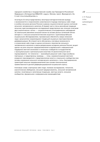 The article presents some methodological considerations on the possibilities and limitations of the qualitative approach (repeated case studies in the specific Russian region) for the sociological assessment of human capital. In the first part of the article, the author considers the Russian tradition of rural studies as combining two analytical ‘optics’ - sociological/ethnographic observations of local realities based on various combinations of qualitative techniques and a strong anthropological/ peasant-studies emphasis with large-scale social surveys aimed at macro-descriptions of agrarian reforms, rural social/human capital and agro-industrial complex under the persistent trends of social-spatial differentiation. In the second part, the author mentions the key possibilities and limitations of case studies for assessing the state and prospects of rural human capital in the most depressed rural region of Russia, focusing on the role of entrepreneurs in formal and informal support of the local rural economy and communities in cooperation with municipal and regional authorities. In the final part, the author emphasizes typologies as the analytical result of rural case studies (especially the repeated ones) and provides examples - ‘types’ of the local agricultural producer relationships with the rural settlement’s authorities and community (as the basis for preserving rural human capital) and ‘types’ of the rural entrepreneurs’ biographical trajectories (as the basis for the generational continuity of this differentiated rural stratum).