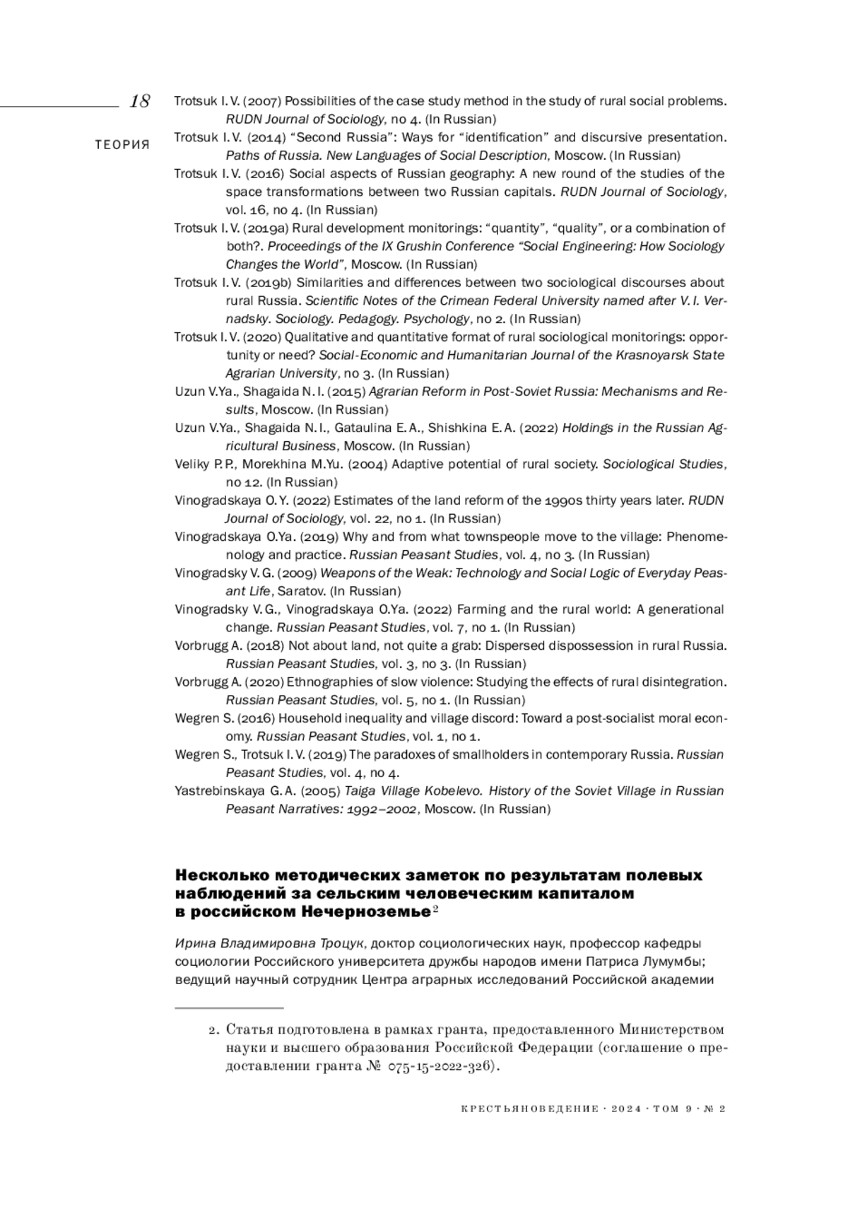61. Trotsuk I. V. (2019b) Similarities and differences between two sociological discourses about rural Russia. Scientific Notes of the Crimean Federal University named after V. I. Vernadsky. Sociology. Pedagogy. Psychology, no 2. (In Russian).