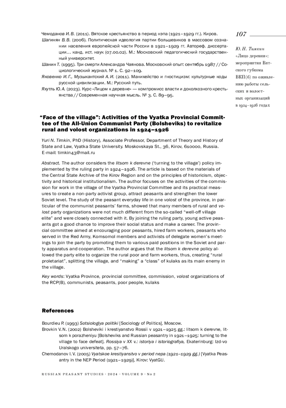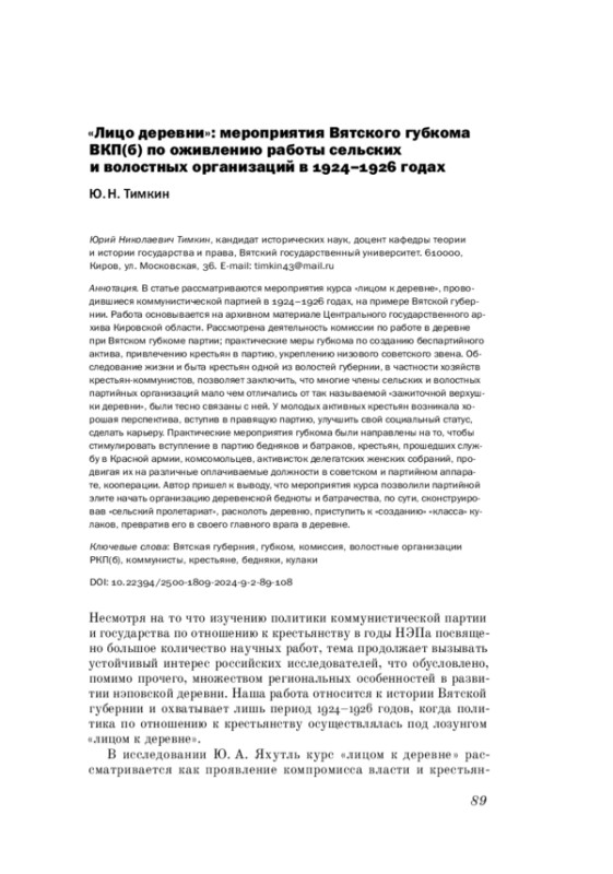 ТИМКИН Ю. Н. "ЛИЦО ДЕРЕВНИ": МЕРОПРИЯТИЯ ВЯТСКОГО ГУБКОМА ВКП(Б) ПО ОЖИВЛЕНИЮ РАБОТЫ СЕЛЬСКИХ И ВОЛОСТНЫХ ОРГАНИЗАЦИЙ В 1924-1926 ГОДАХ // КРЕСТЬЯНОВЕДЕНИЕ. 2024. Т. 9 № 2