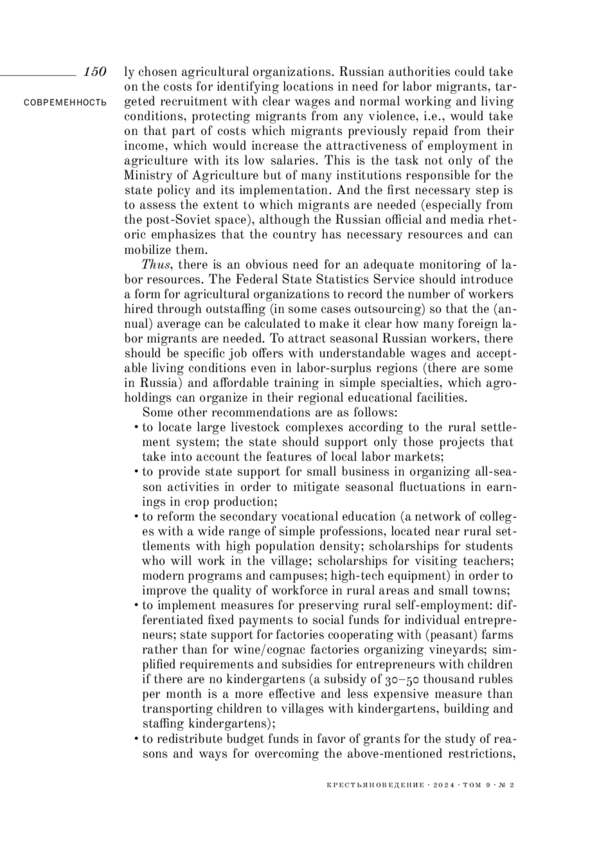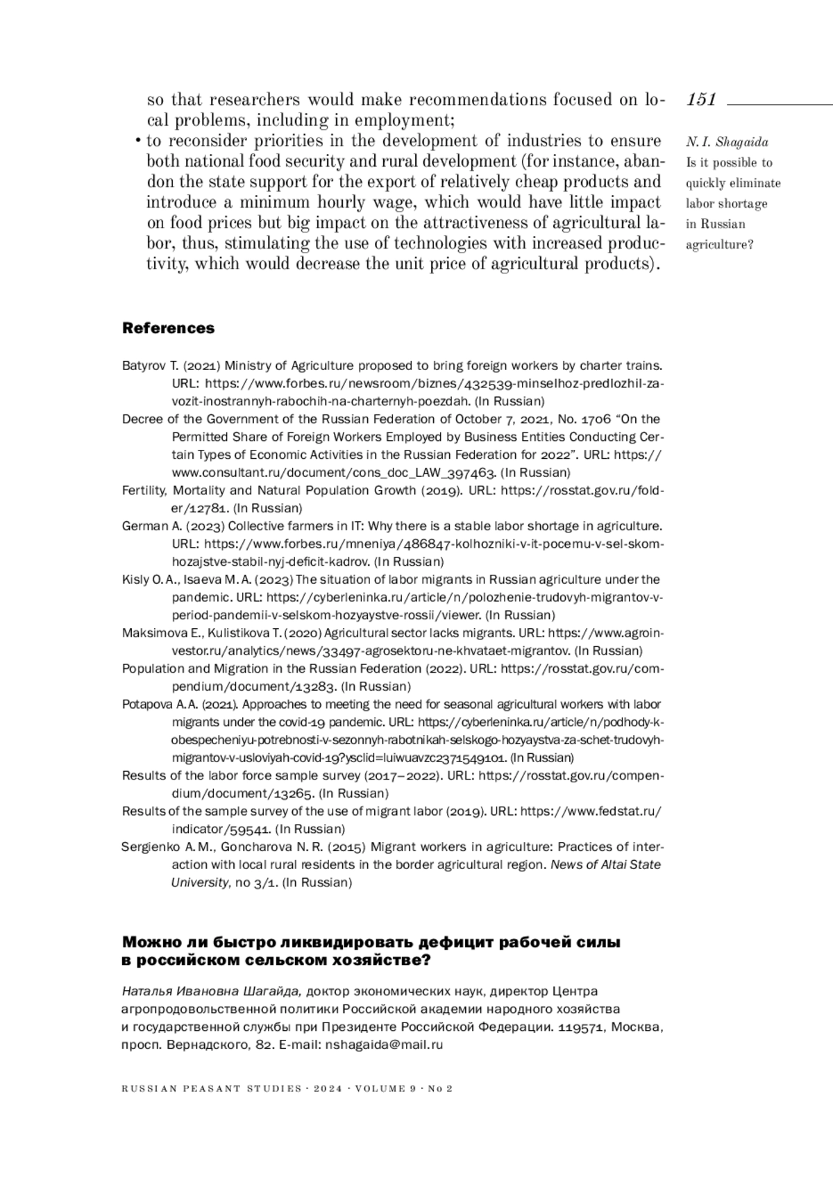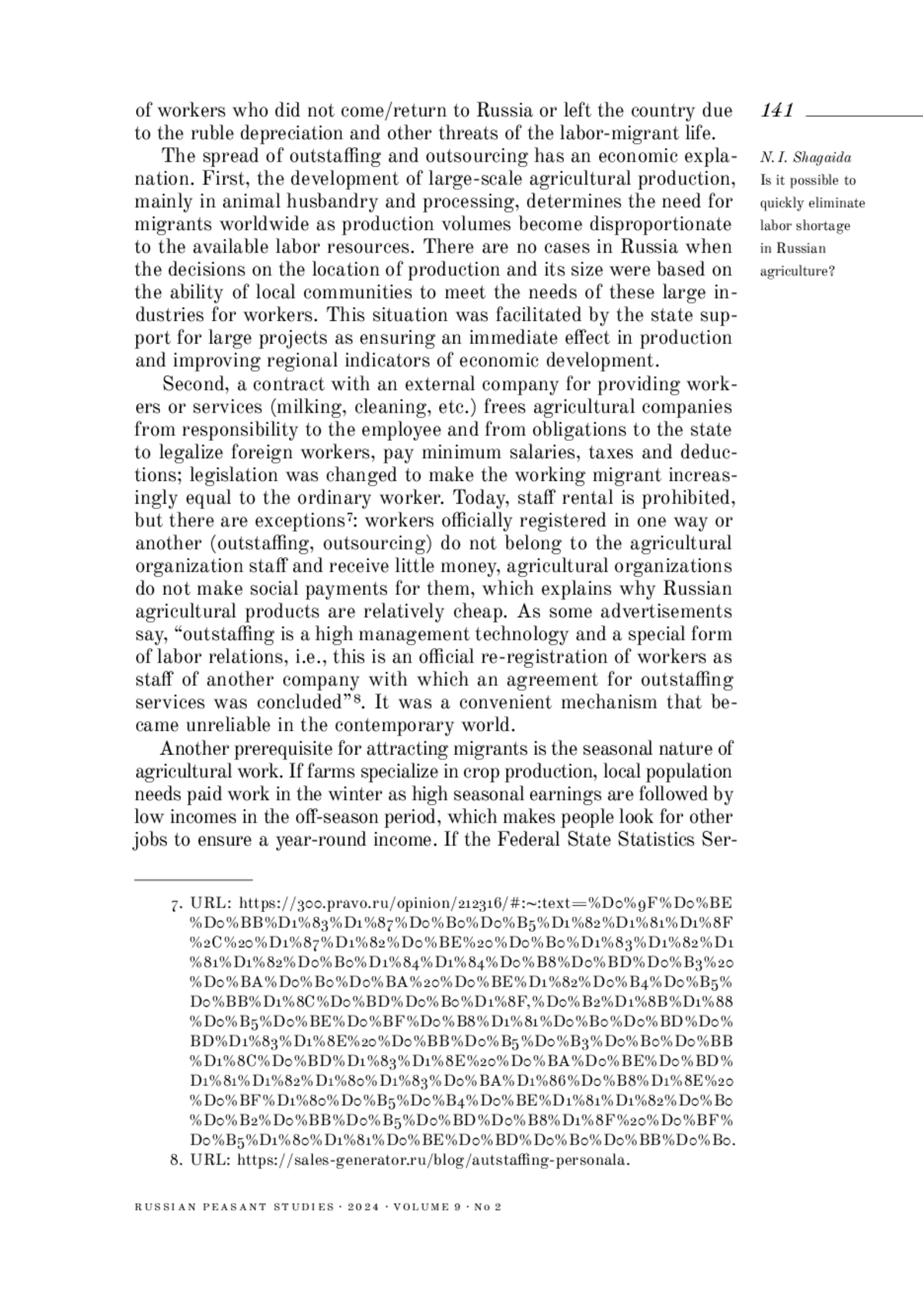 ШАГАЙДА Н. И. IS IT POSSIBLE TO QUICKLY ELIMINATE LABOR SHORTAGE IN RUSSIAN AGRICULTURE? // КРЕСТЬЯНОВЕДЕНИЕ. 2024. Т. 9 № 2