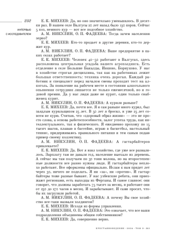 В интервью Е. К. Михеева, доктора экономики и менеджмента, генерального директора агрохолдинга «Нива-Михеев и Компания», заслуженного работника сельского хозяйства Российской Федерации, почетного гражданина Нижегородской области и Бутурлинского района, записанном социологами А. М. Никулиным и О. П. Фадеевой в августе 2023 года, раскрывается жизненный путь выходца из крестьянской колхозной семьи в мир современной аграрной науки, политики и бизнеса. Особое внимание уделяется обсуждению хозяйственной философии агроменеджера Михеева, логике принятия им решений на этапах колхозной жизни СССР, постсоветских времен становления рыночной экономики 1990-х годов, характеристике положения дел в его хозяйстве, аграрной экономике и сельском развитии Нижегородской области и всей сельской России. В центре интервью находятся вопросы рационального выбора принимаемых и реализуемых экономических решений в специфических условиях трансформации национальной и местной институциональной среды.