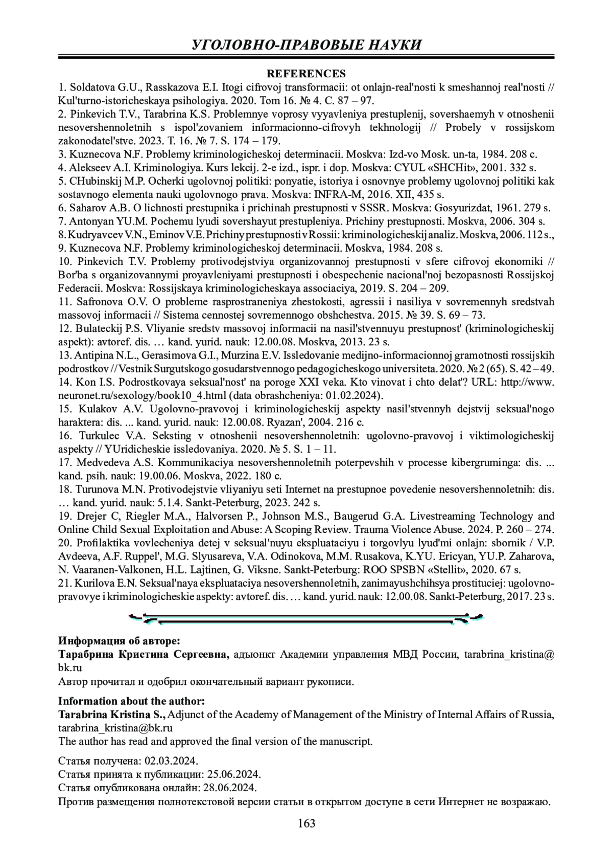 2. Пинкевич Т.В., Тарабрина К.С. Проблемные вопросы выявления преступлений, совершаемых в отношении несовершеннолетних с использованием информационно-цифровых технологий // Пробелы в российском законодательстве. 2023. Т. 16. № 7. С. 174 - 179. EDN: RYMZIH