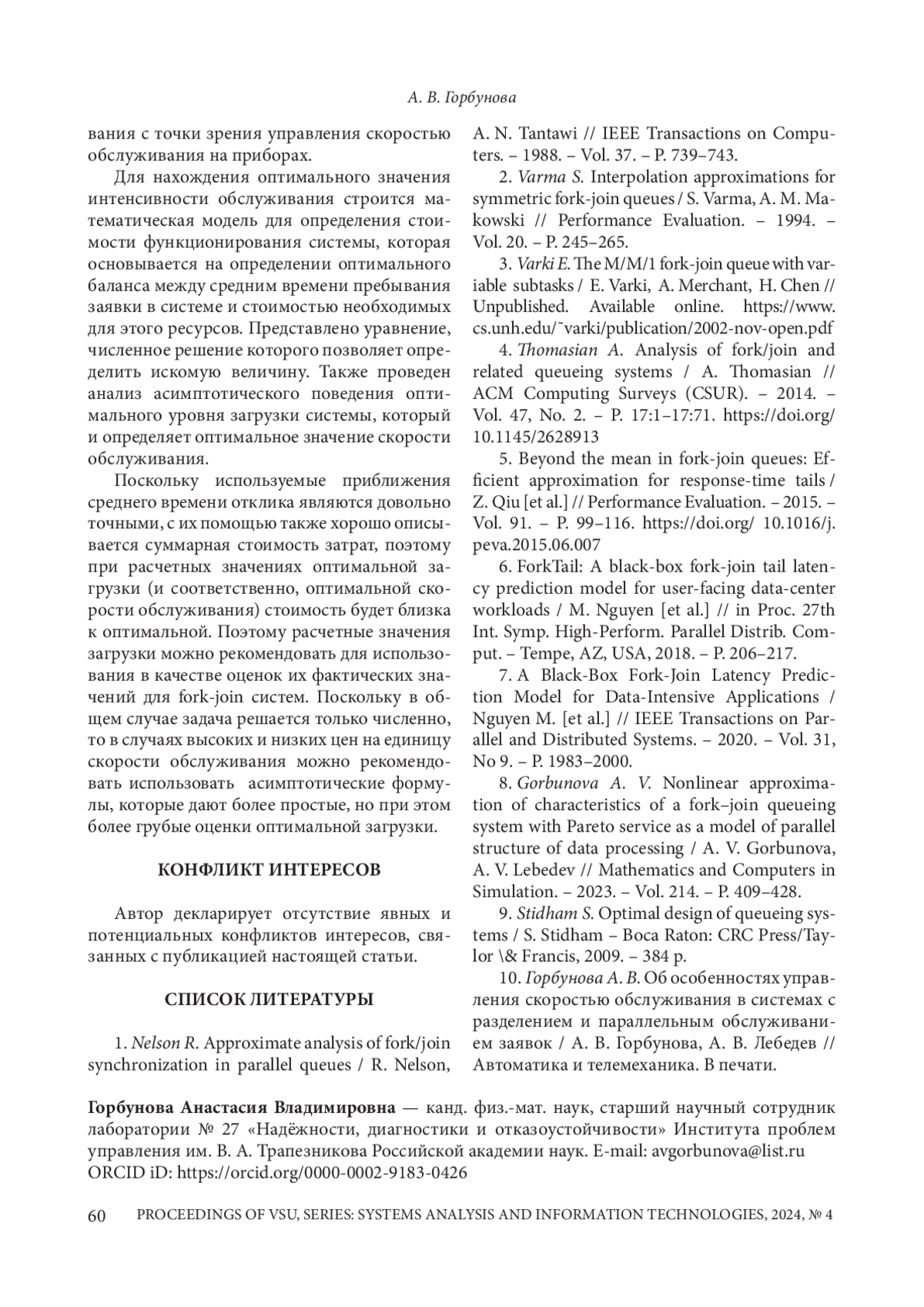 8. Gorbunova A. V. Nonlinear approximation of characteristics of a fork-join queueing system with Pareto service as a model of parallel structure of data processing / A. V. Gorbunova, A. V. Lebedev // Mathematics and Computers in Simulation. - 2023. - Vol. 214. - P. 409-428. EDN: USRKYX