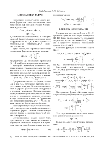 Ключевые фразы: математическая модель, динамика развития фирмы, оптимальное управление, ПРИНЦИП МАКСИМУМА ПОНТРЯГИНА
