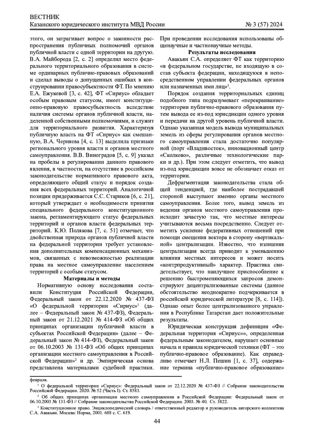 3. Ежукова О.А. Территории с особым публично-правовым статусом как фактор федеративной политики России // Конституционное и муниципальное право. 2021. № 3. С. 36 - 45. EDN: VPSKOE