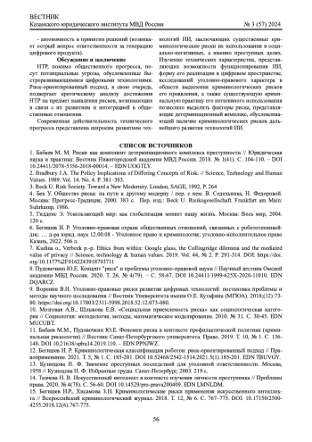 12. Бегишев И. Р. Криминологическая классификация роботов: риск-ориентированный подход // Правоприменение. 2021. Т. 5, № 1. С. 185-201. DOI: 10.52468/2542-1514.2021.5(1).185-201 EDN: TBUVGY