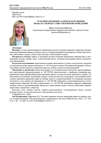 Введение: в статье рассматриваются проблемные аспекты уголовно-правового характера, возникающие при нарушении права на свободу совести и вероисповеданий; анализируются объект преступления, объективная сторона, субъект преступления и субъективная сторона. Материалы и методы: наряду со всеобщим методом познания применялись общенаучные и частнонаучные методы: прежде всего, статистический метод, системно-структурный анализ, аналитическое обследование. Результаты исследования: представлена позиция законодателя и ученых относительно элементов состава преступления, предусмотренного ст. 148 Уголовного кодекса Российской Федерации. Обозначена общественная опасность нарушения права на свободу совести и вероисповеданий. Обсуждение и заключение: автор констатирует, что незначительное количество зарегистрированных преступлений, предусмотренных ст. 148 УК РФ, свидетельствует о проблемах понимания правоприменителями криминообразующих признаков данного состава уголовно-наказуемого деяния. Это обусловлено различными суждениями ученых и недостаточностью проводимых исследований обязательных признаков нарушения права на свободу совести и вероисповеданий, что порождает высокую латентность этого деяния. Но применение ст. 148 УК РФ необходимо в многонациональном и поликонфессионом обществе. Поэтому в примечании к ст. 148 УК РФ необходимо закрепить дефиниции свободы совести и вероисповеданий; определить, какие деяния следует отнести к действиям, выражающим явное неуважение к обществу.